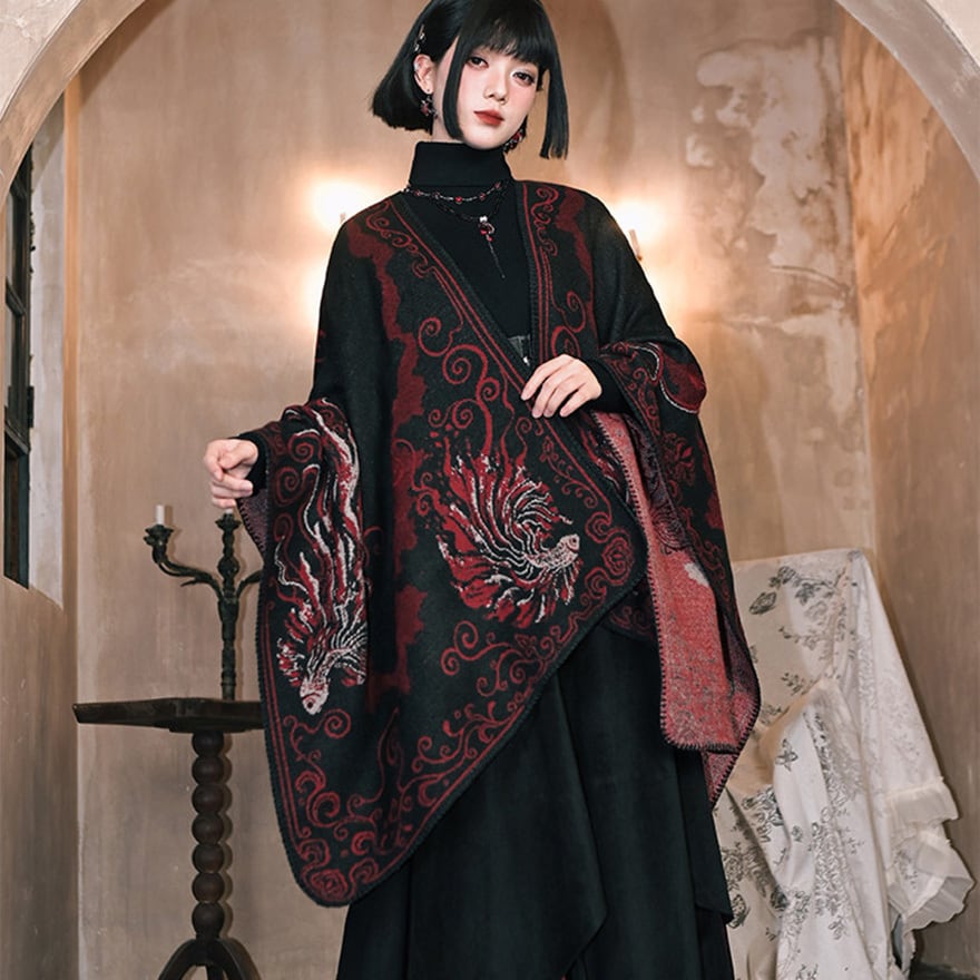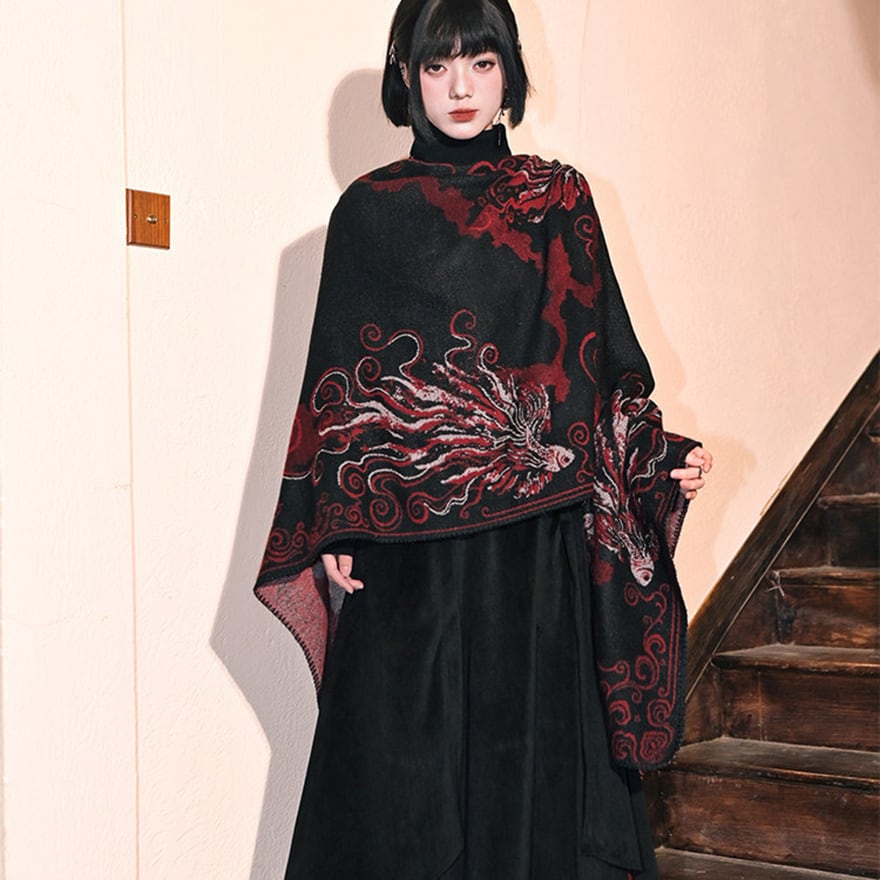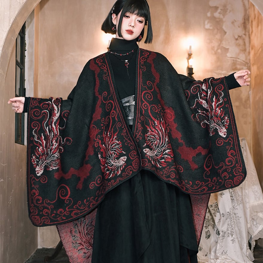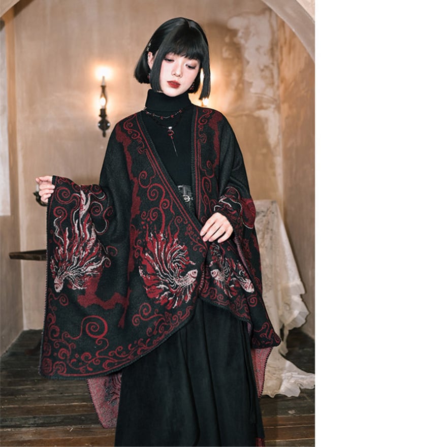 黒を基調に深紅の金魚模様を配した、和ゴシックテイストの大判ショールです。