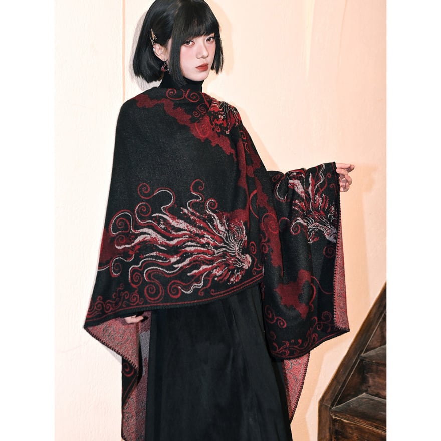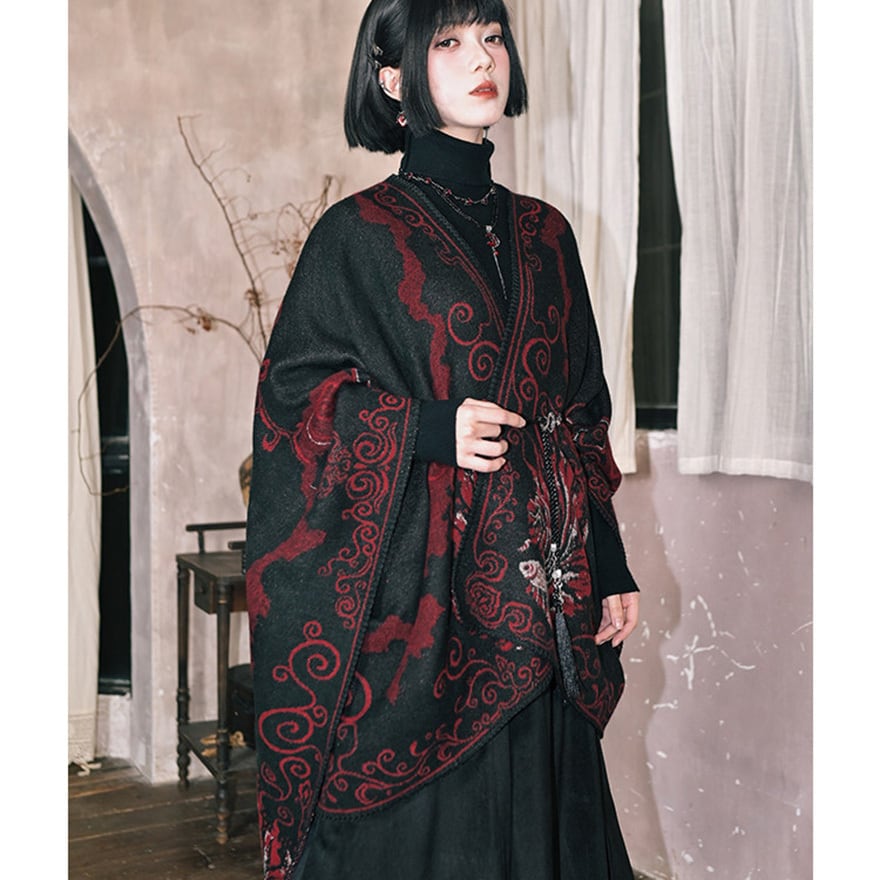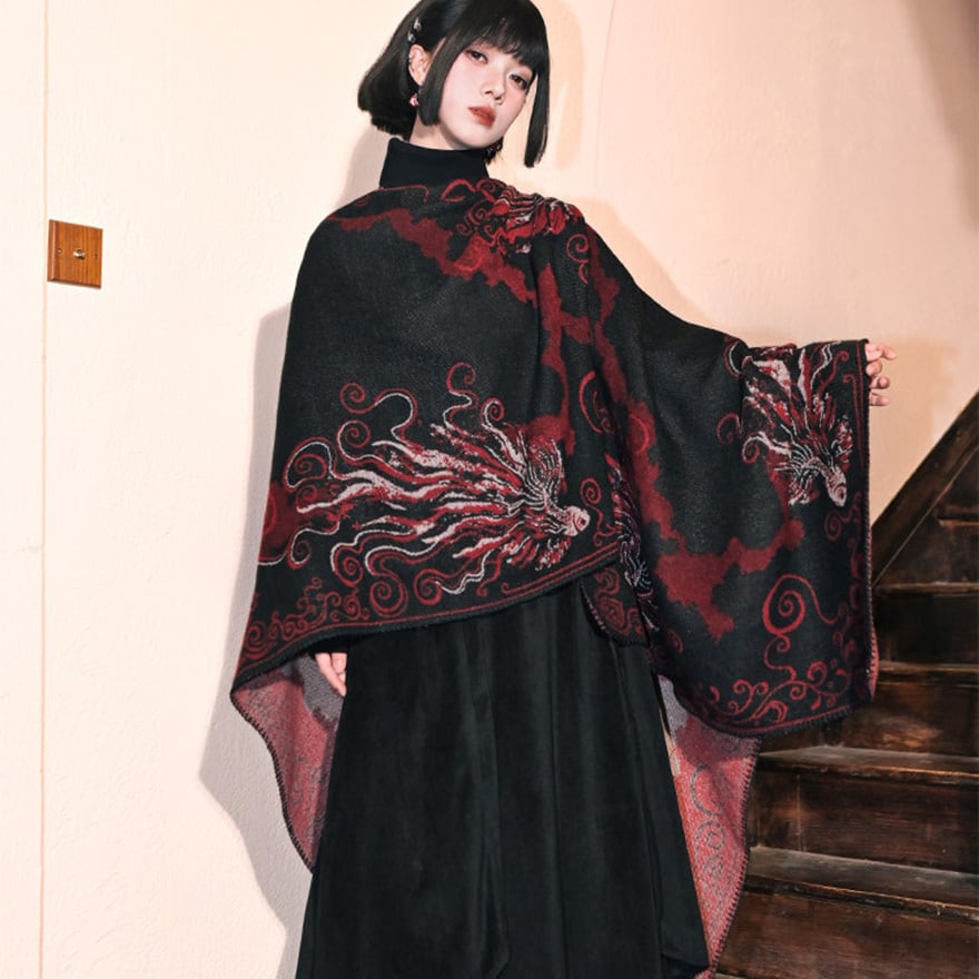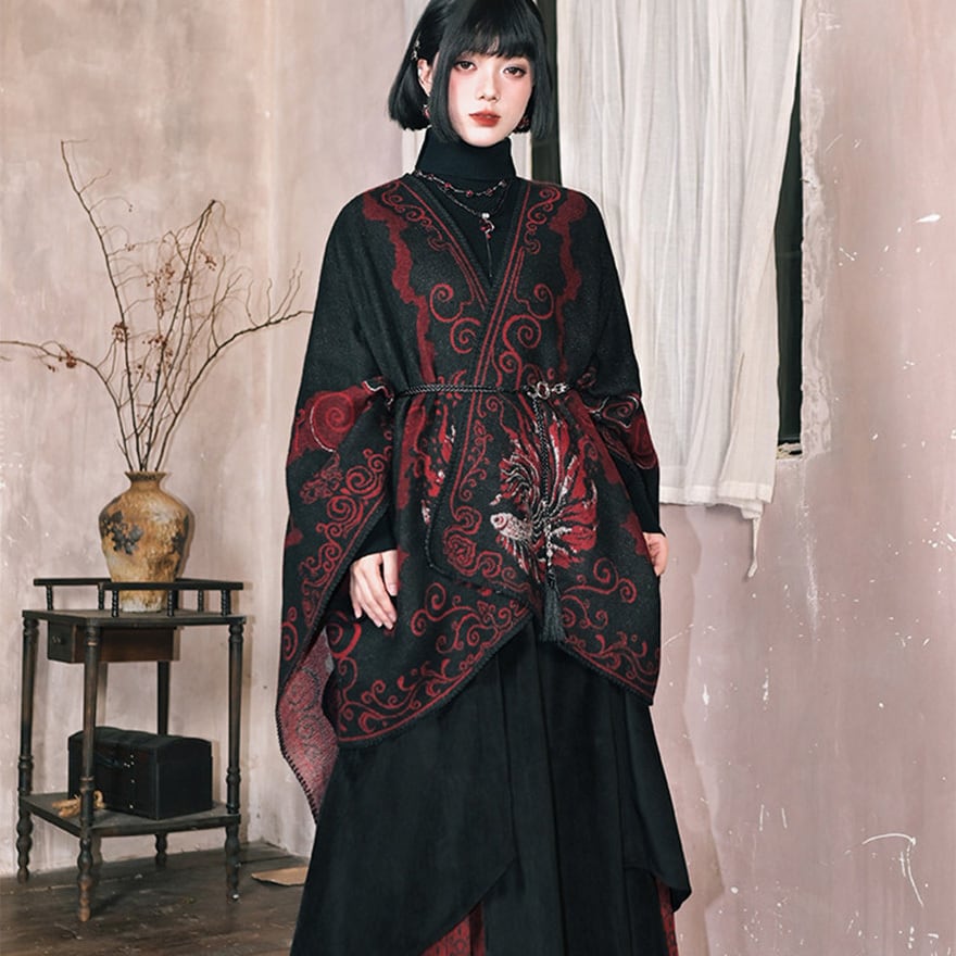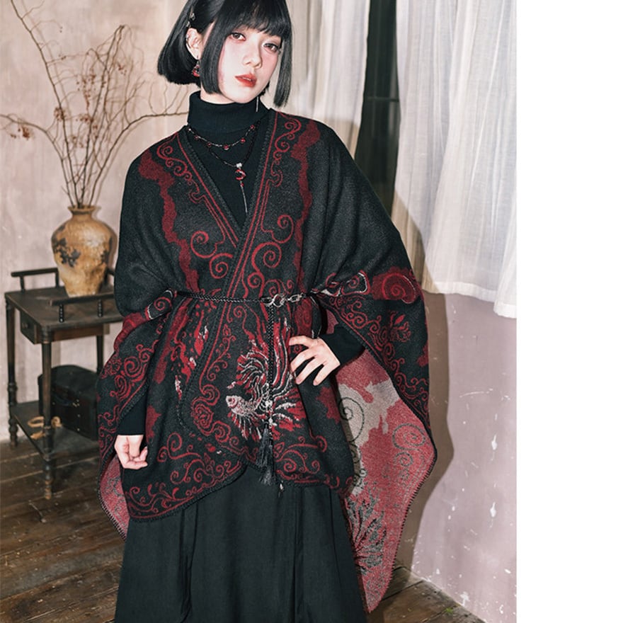 黒を基調に深紅の金魚模様を配した、和ゴシックテイストの大判ショールです。