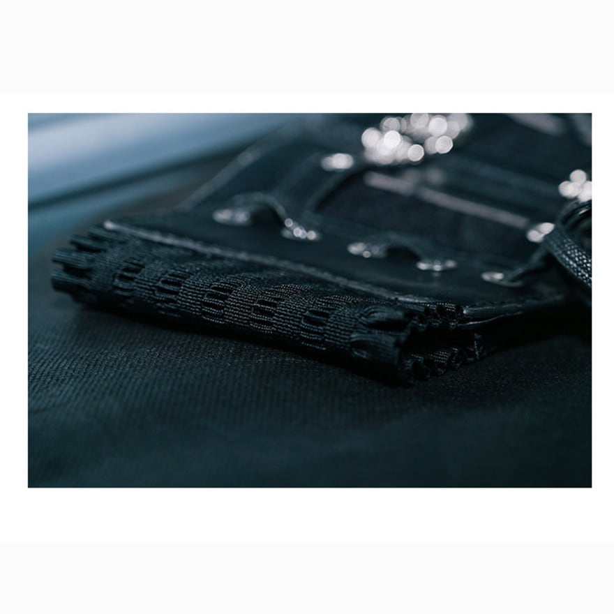本格的なコルセットは着脱が困難ですが、本作は背面ゴム仕様により、日常のファッションへ手軽にエッジの効いたアクセントを加えることができます。