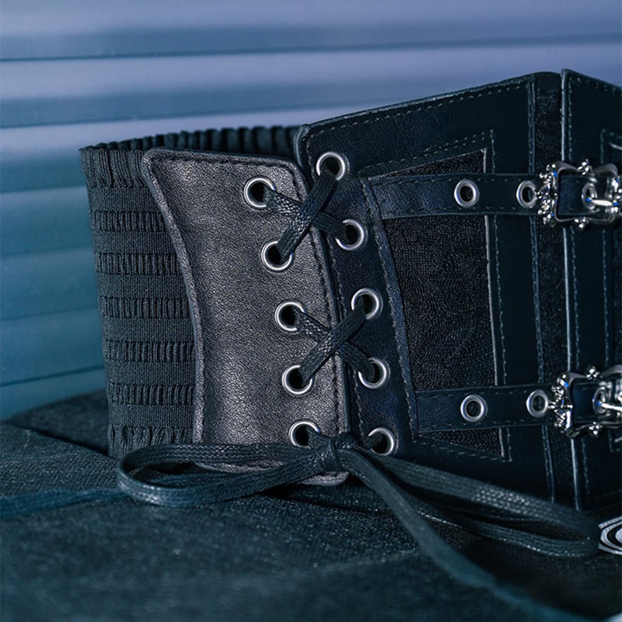 黒のフェイクレザーと繊細なレースを組み合わせた、ダブルレースアップ仕様のコルセットベルトです。