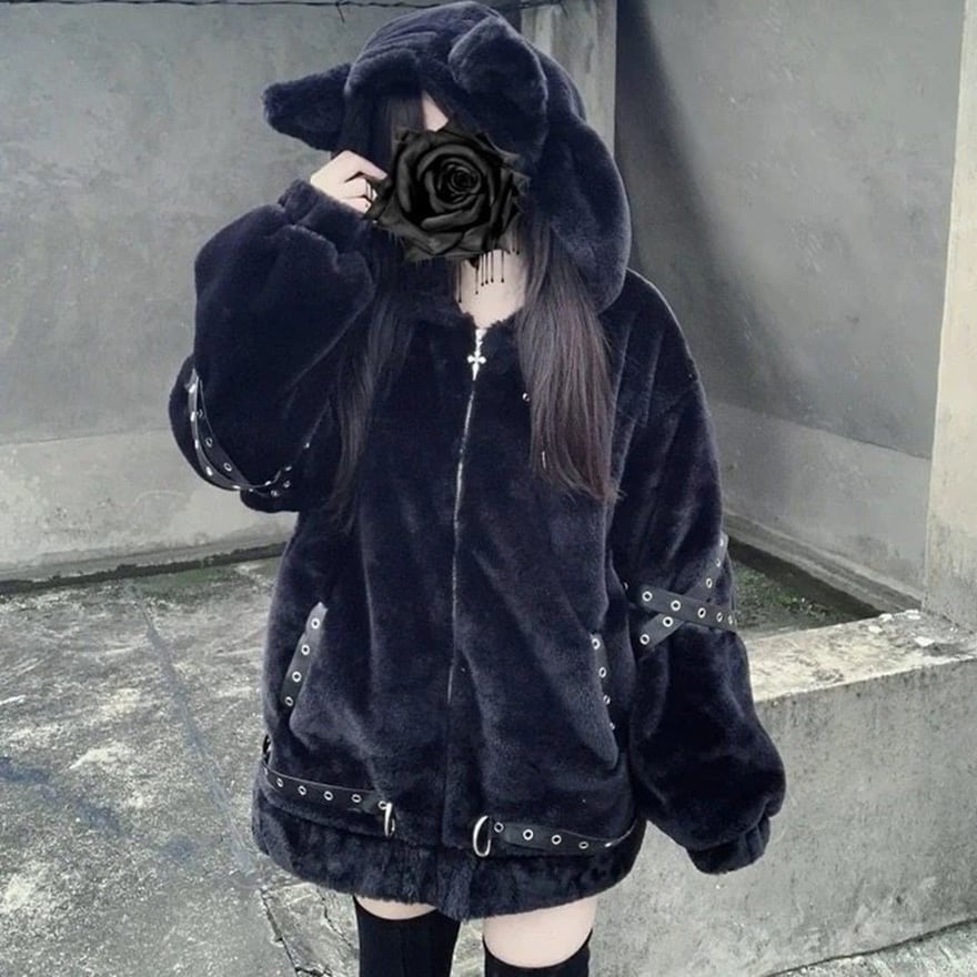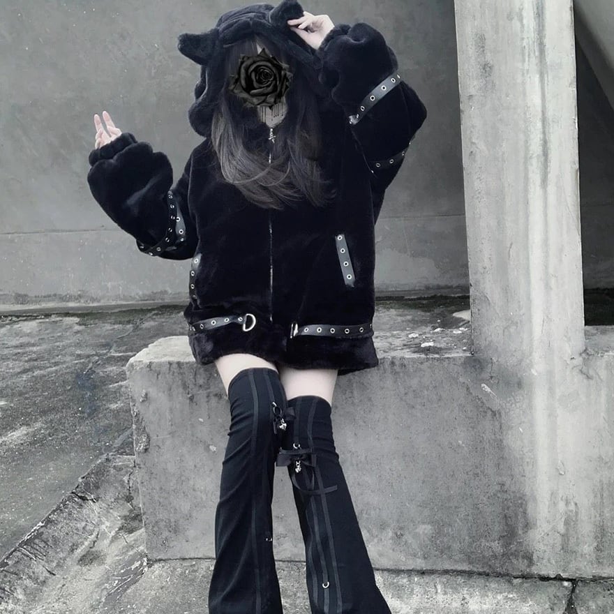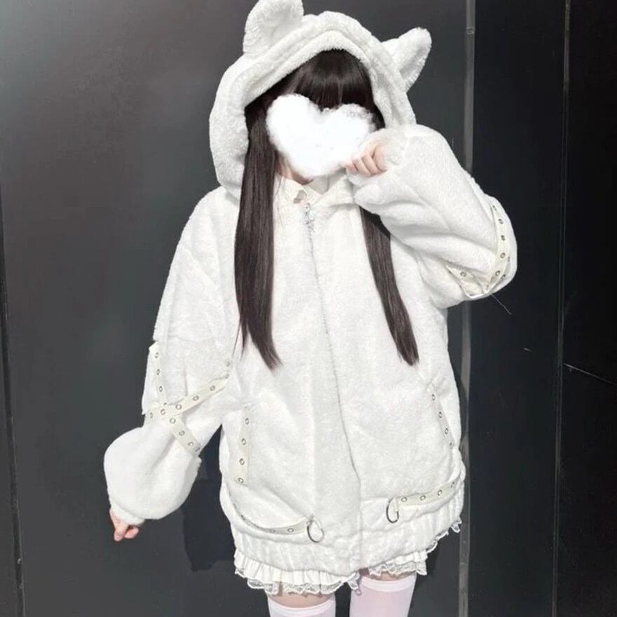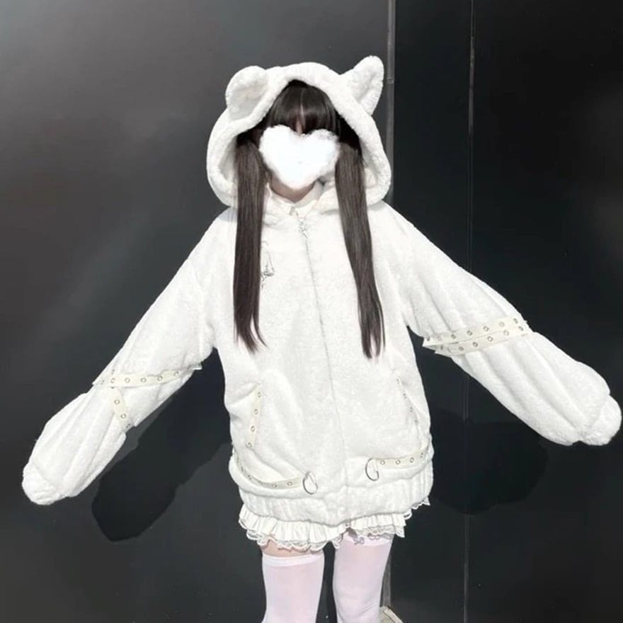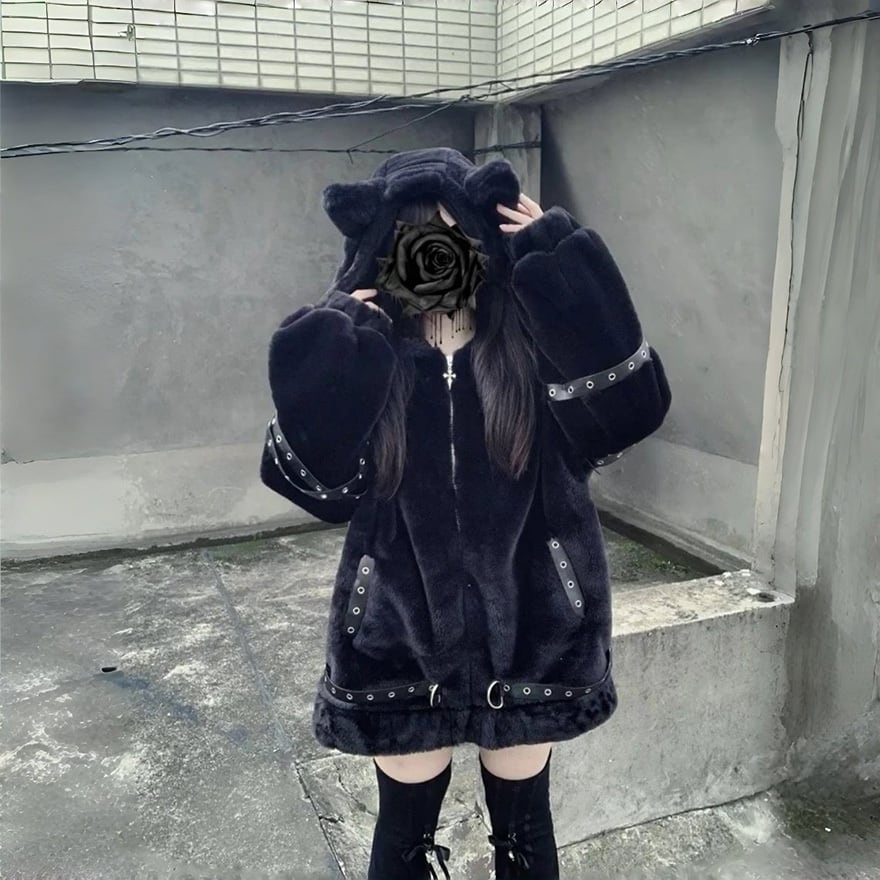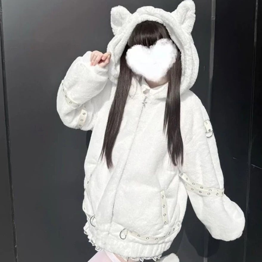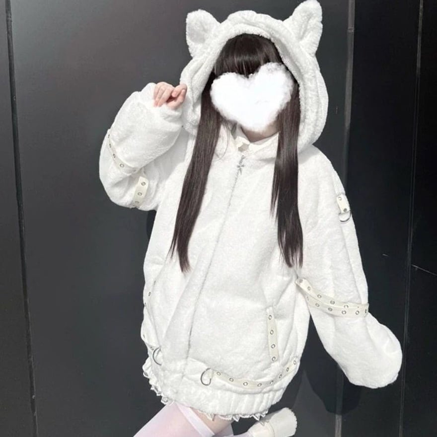 フードには可愛らしい猫耳が施され、袖や裾、ポケットにはパンク要素を感じさせるハトメ付きベルトが装飾されています。