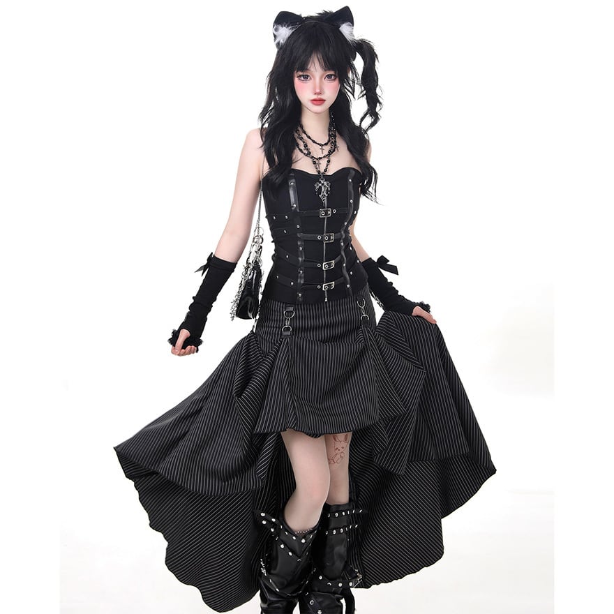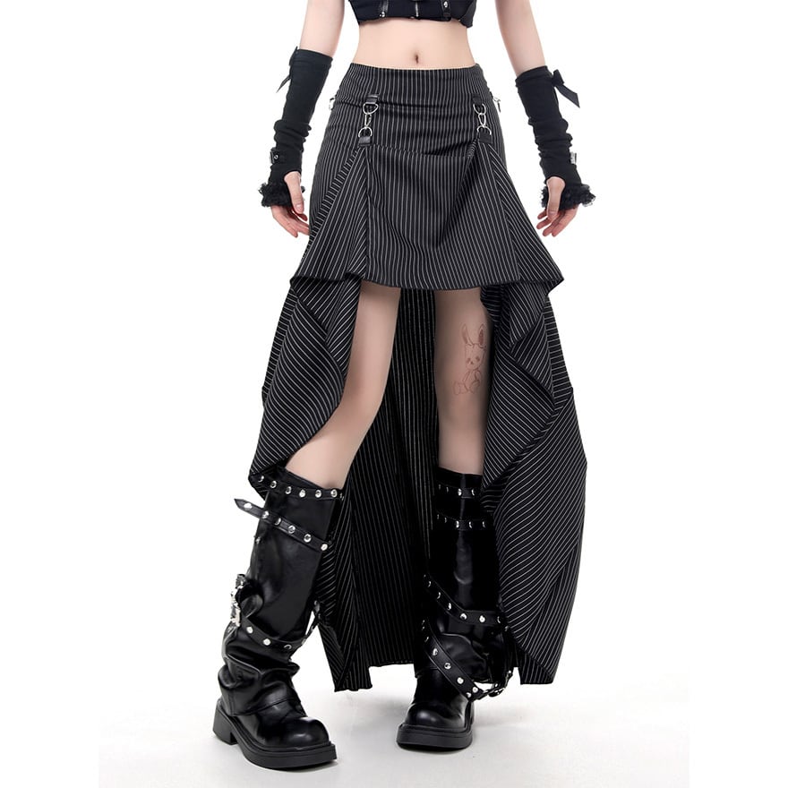 ゴシック寄りなジャンルのロングスカートです。黒色の生地に白色の細い縦縞が入ったデザインで、前方が短く後方が長いフィッシュテール構造が最大の特徴です。