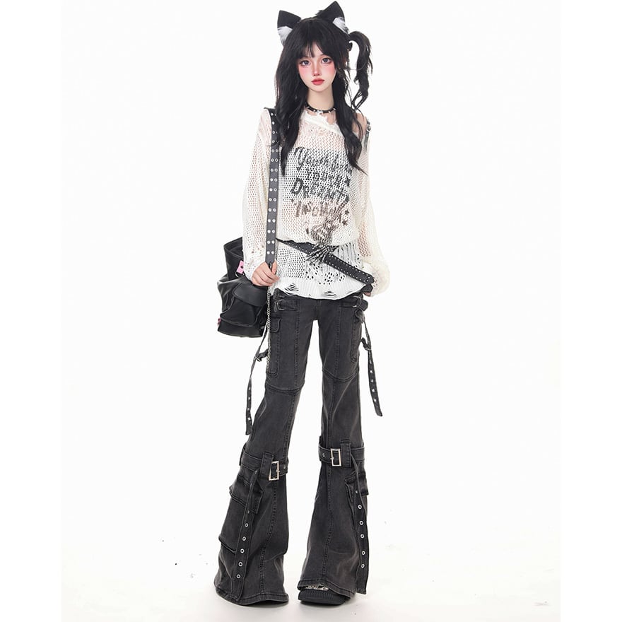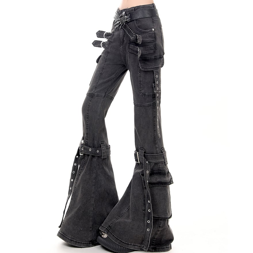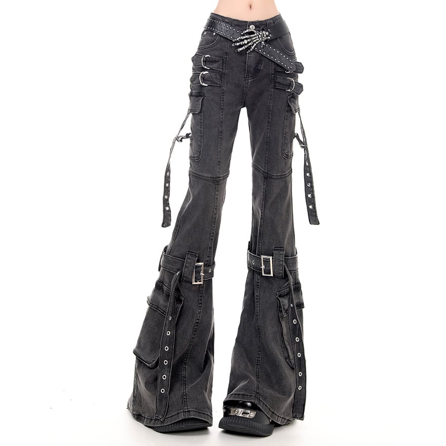 膝下から裾にかけて大きく広がるフレアシルエットが特徴で、太もも部分のカーゴポケットや随所に配置されたバックルベルト、金属パーツがパンク・テックウェア的な要素を演出します。
