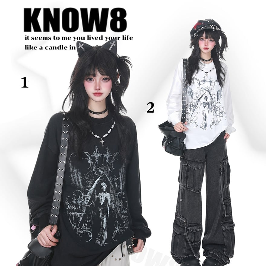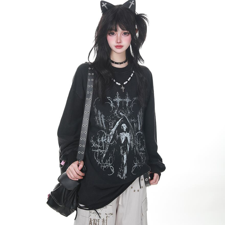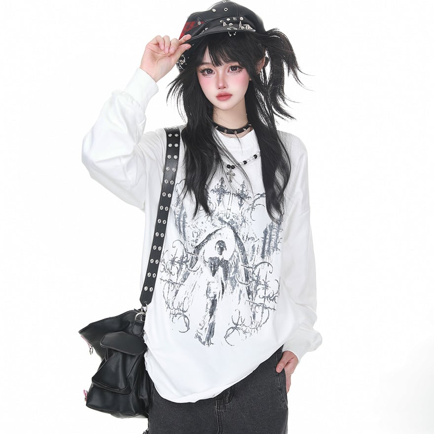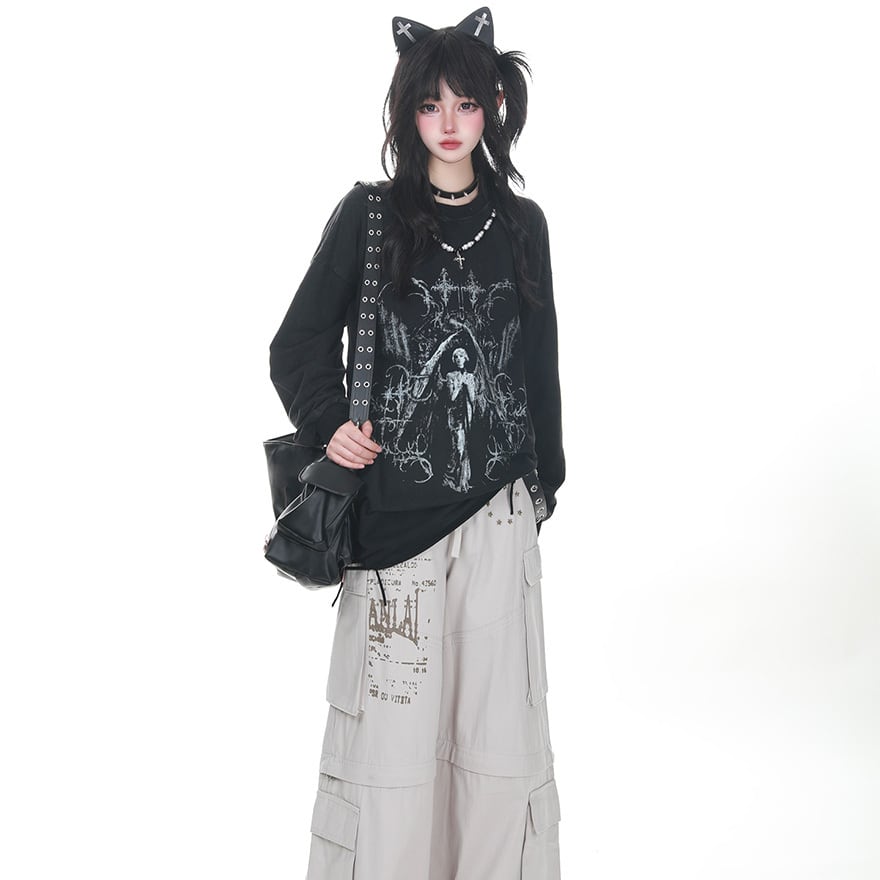 パンクゴシック 聖像グラフィック×逆十字プリント オーバーサイズロングスリーブトップス