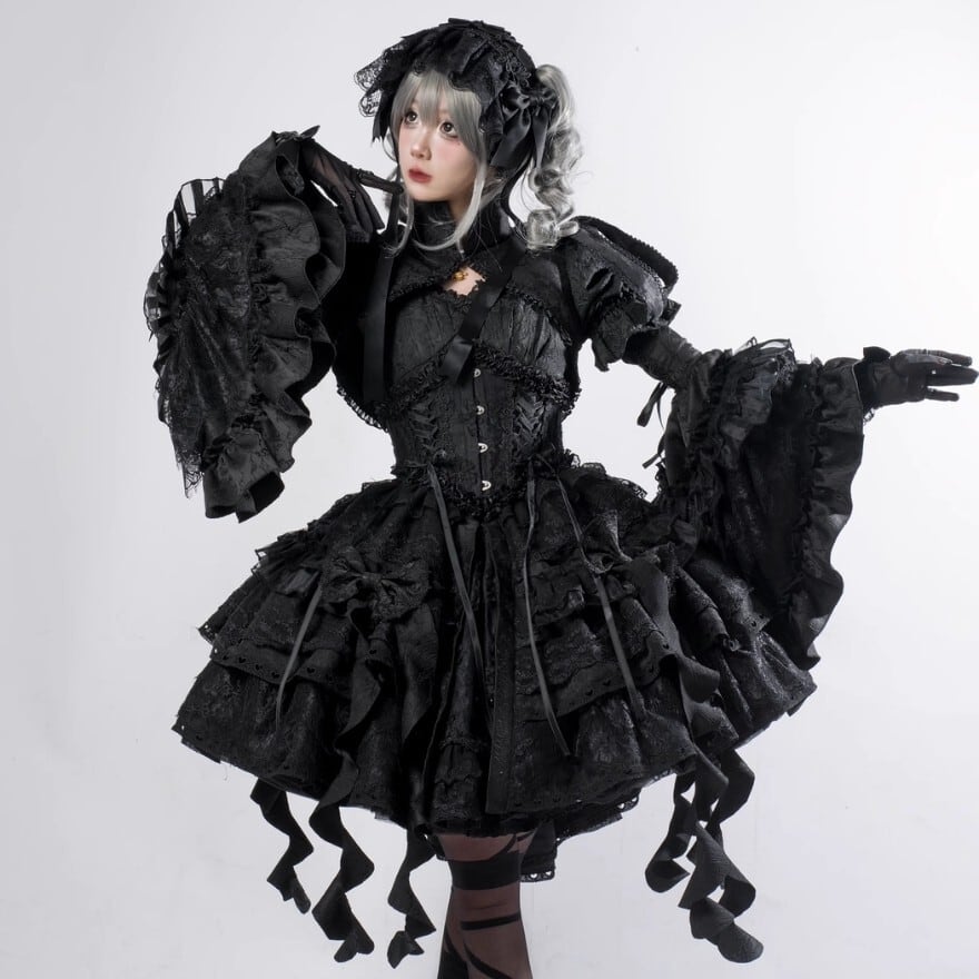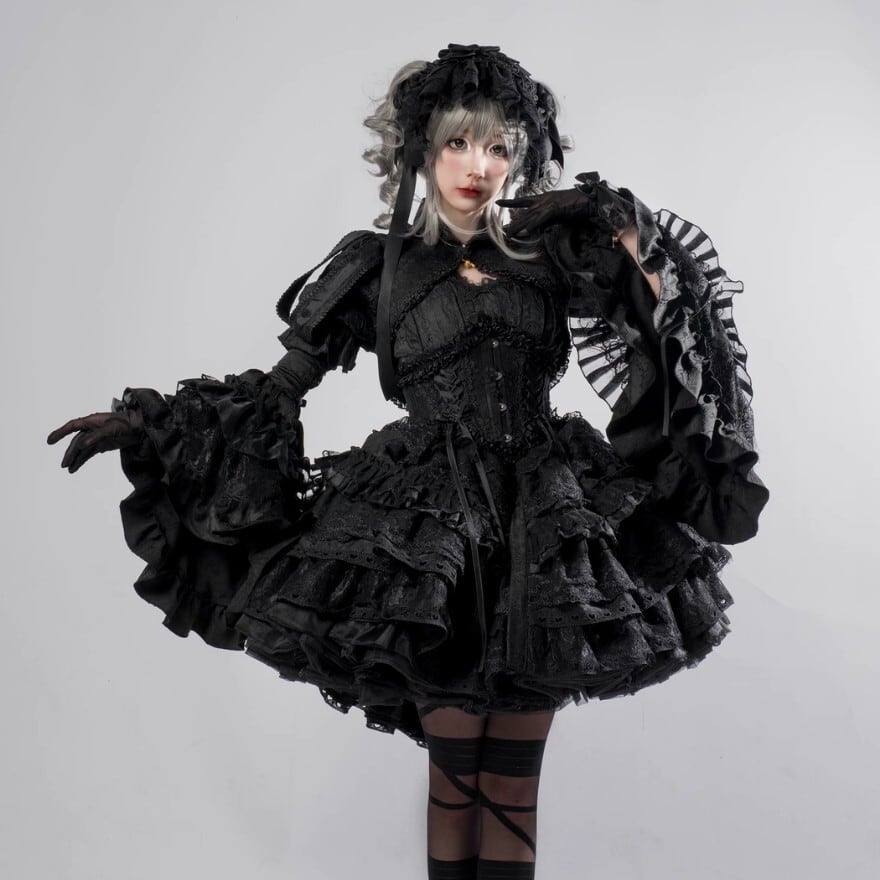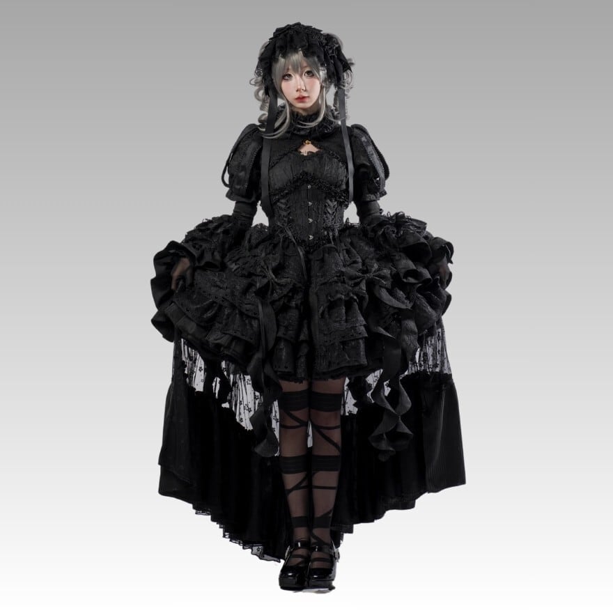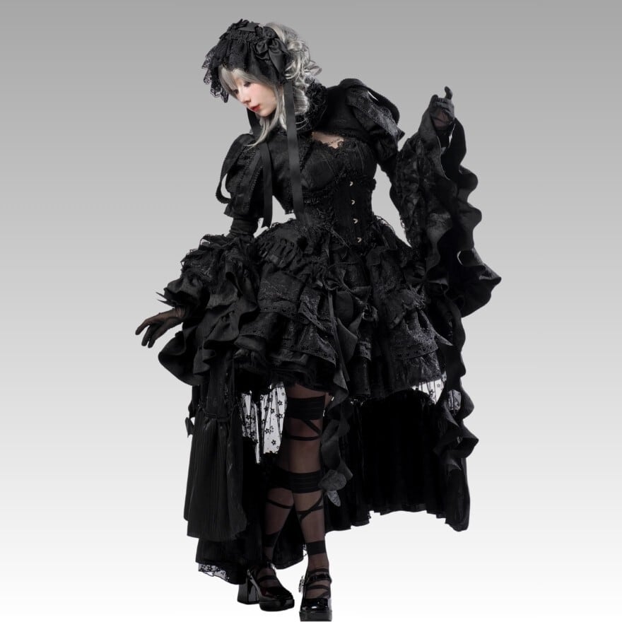ゴシックロリィタの美学を極限まで追求した、重厚感あふれるフルセットドレスです。緻密なジャガード織りの生地を惜しみなく使用し、多段レイヤードフリルとコルセット仕様のボディスが、静止時も動作時も息をのむほど立体的なシルエットを描きます。ブラック・ホワイトの2色展開で、それぞれ異なる世界観を持ちながら、どちらもゴスロリの精神を体現する一着です。