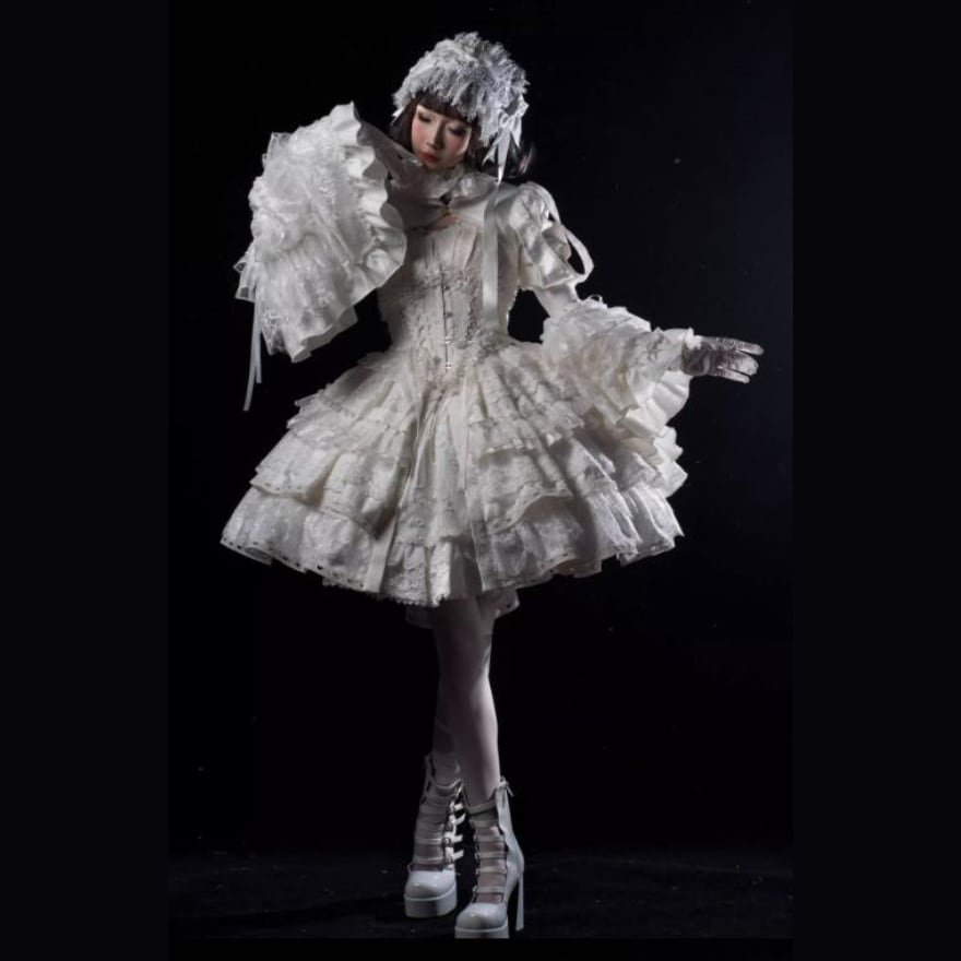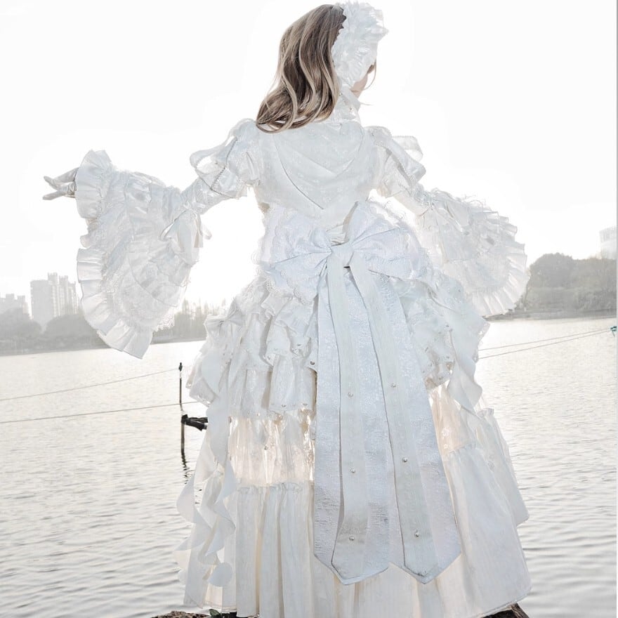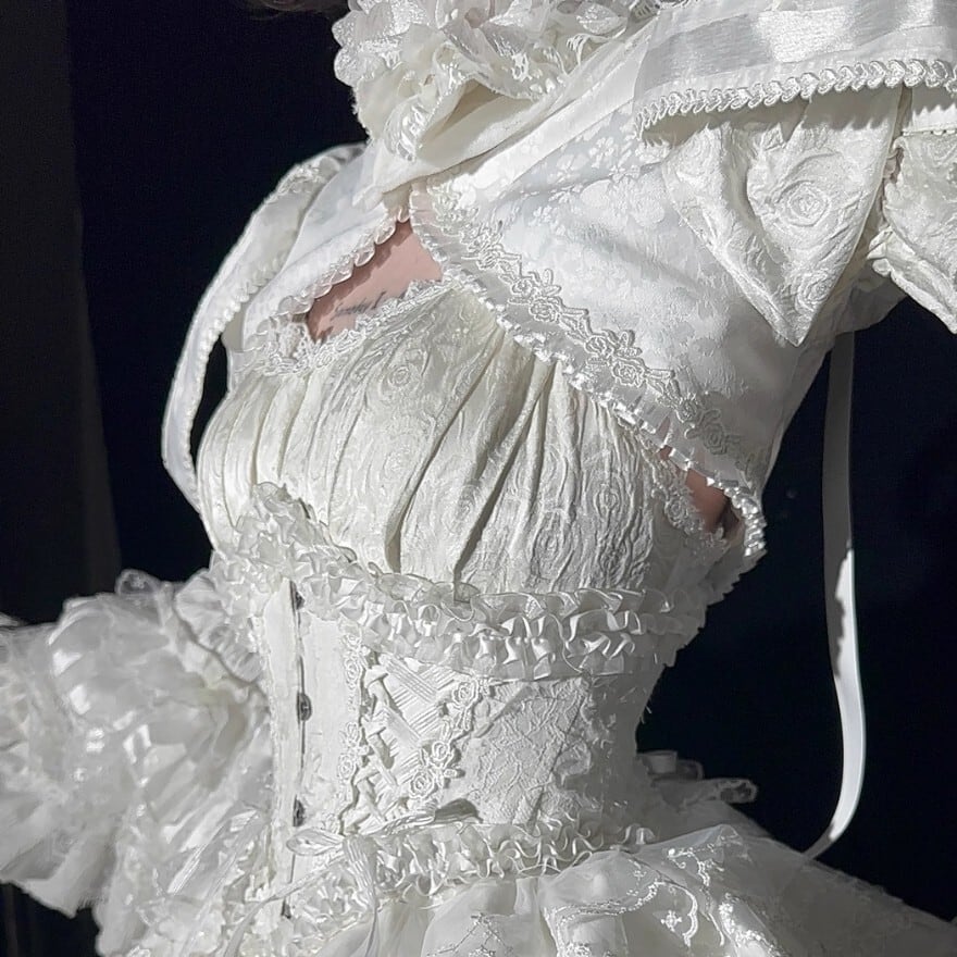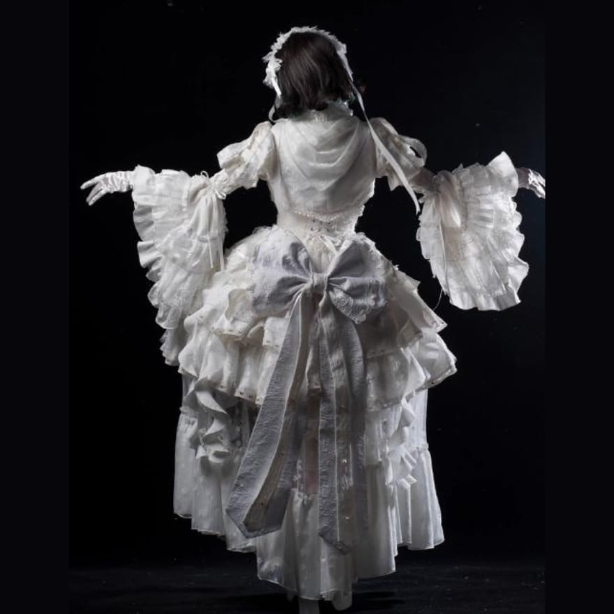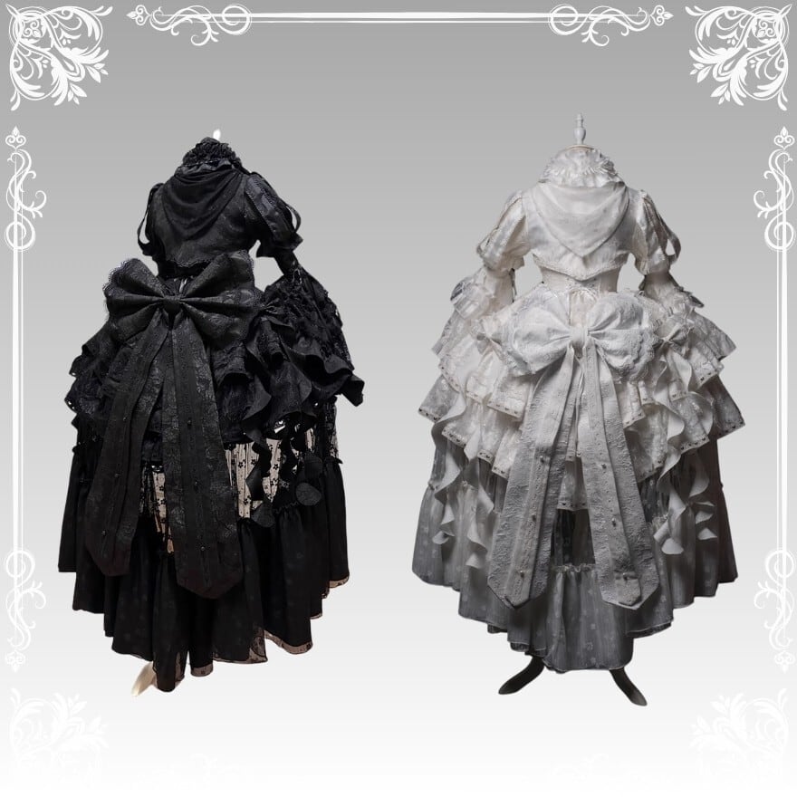 ボディスには縦列のボタンと細やかなレース装飾が施されたコルセット構造を採用。ウエストから裾へと広がる多段フリルスカートは、前方が短く後方が長いフィッシュテール設計で、歩くたびに裾が優雅に揺れるドラマティックな動きを生み出します。ハイネックの幾重にも重なったフリルカラー、ボリューム感のある袖口まで、細部に至るまで妥協のない作り込みです。ブラックはジャガードの陰影が深みと威圧感を、ホワイトはレースと光沢が夢幻的な純白の世界を演出します。