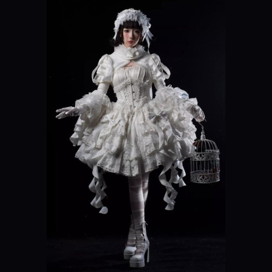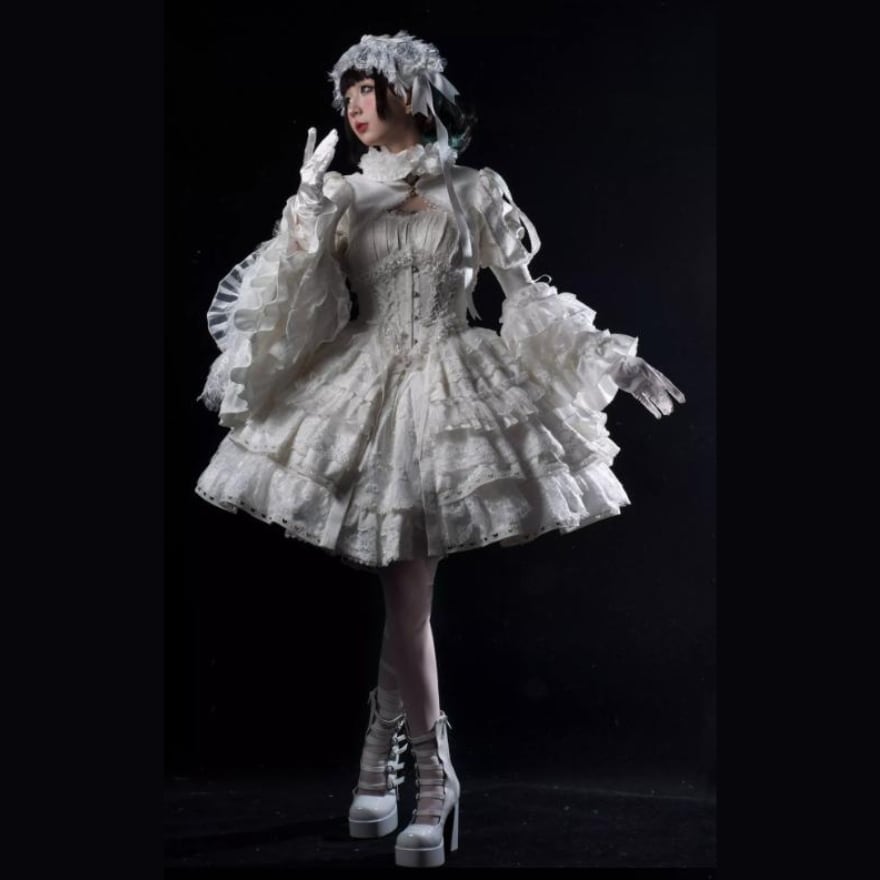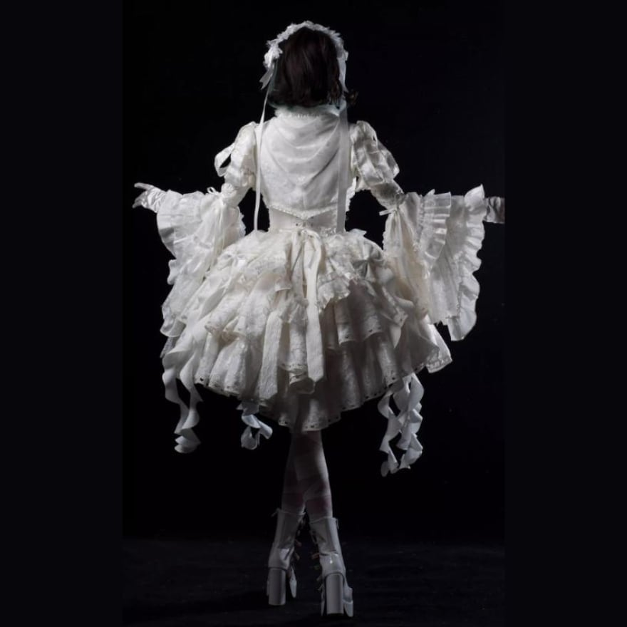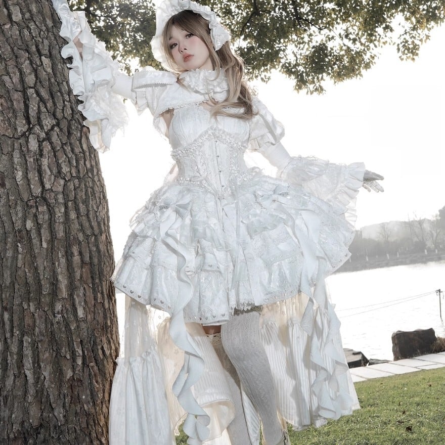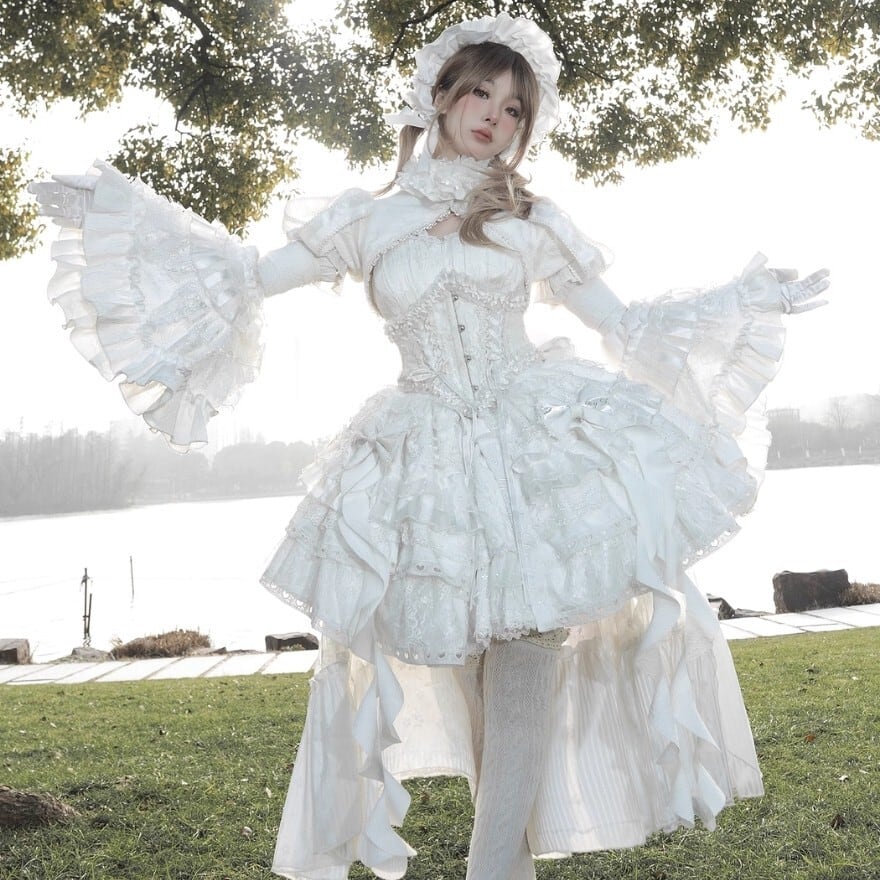 ボディスには縦列のボタンと細やかなレース装飾が施されたコルセット構造を採用。ウエストから裾へと広がる多段フリルスカートは、前方が短く後方が長いフィッシュテール設計で、歩くたびに裾が優雅に揺れるドラマティックな動きを生み出します。ハイネックの幾重にも重なったフリルカラー、ボリューム感のある袖口まで、細部に至るまで妥協のない作り込みです。ブラックはジャガードの陰影が深みと威圧感を、ホワイトはレースと光沢が夢幻的な純白の世界を演出します。
