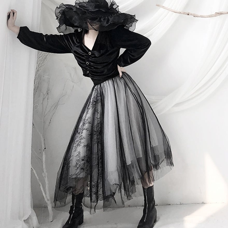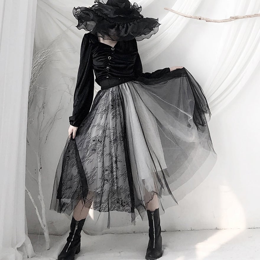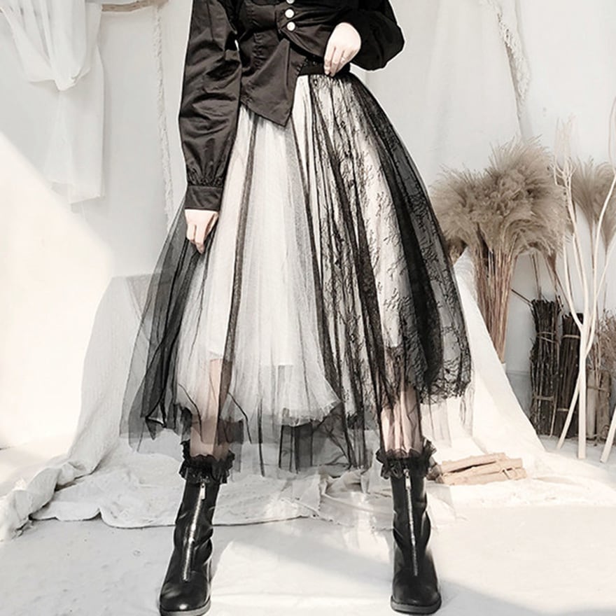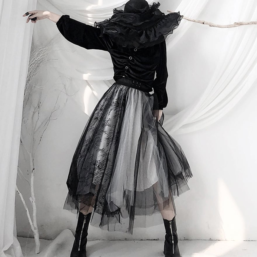 ゴシックファッションを好む方、素材の重なりや透け感を楽しみたい方、ボリュームのあるスカートを探している方。