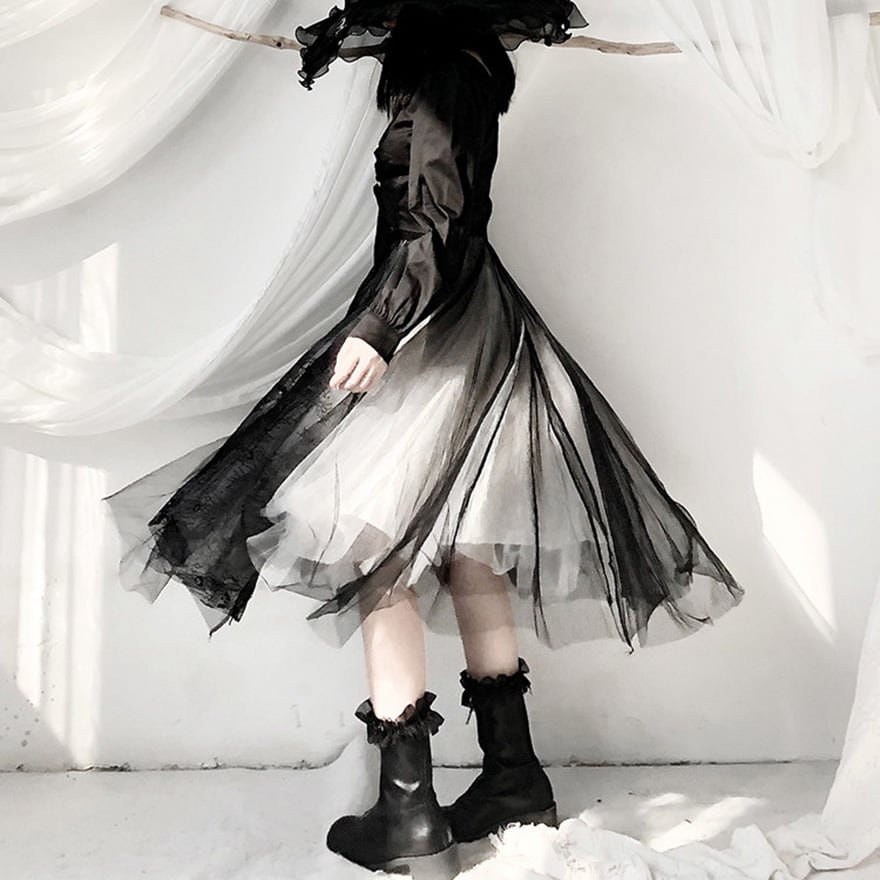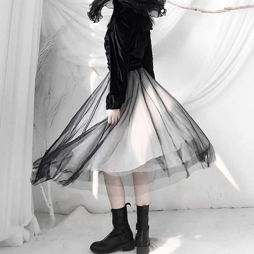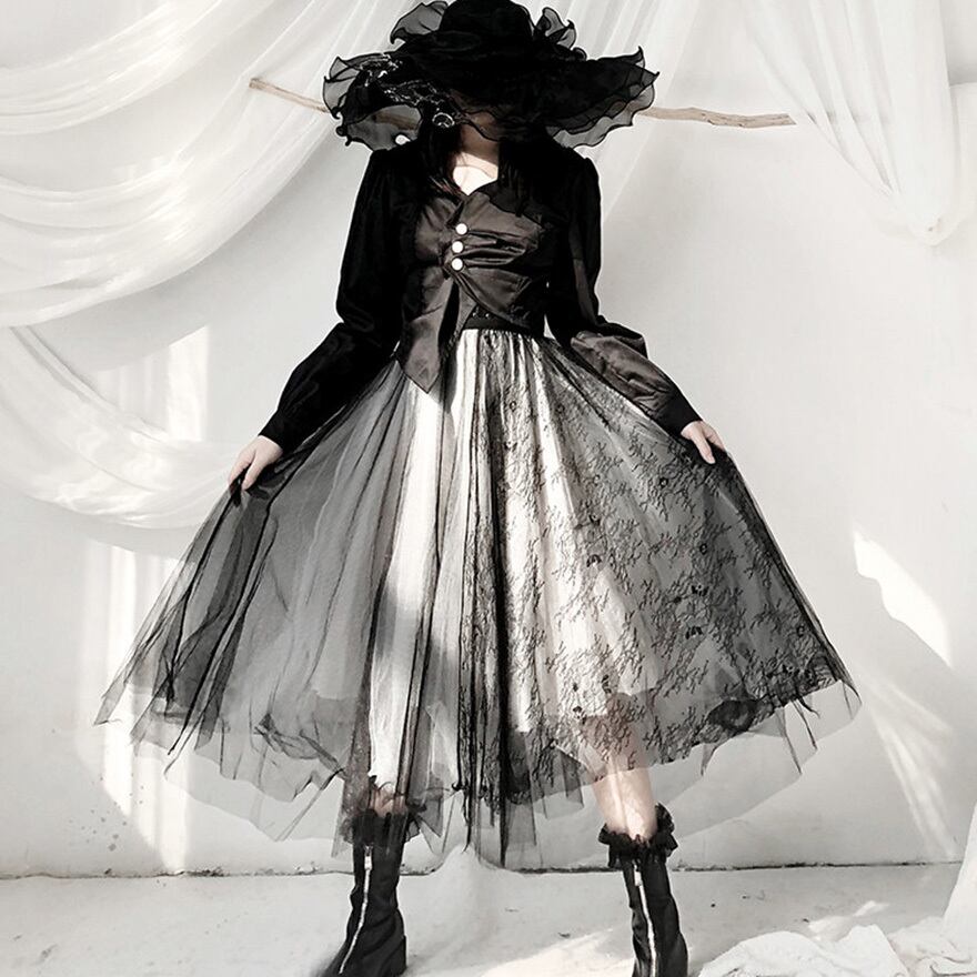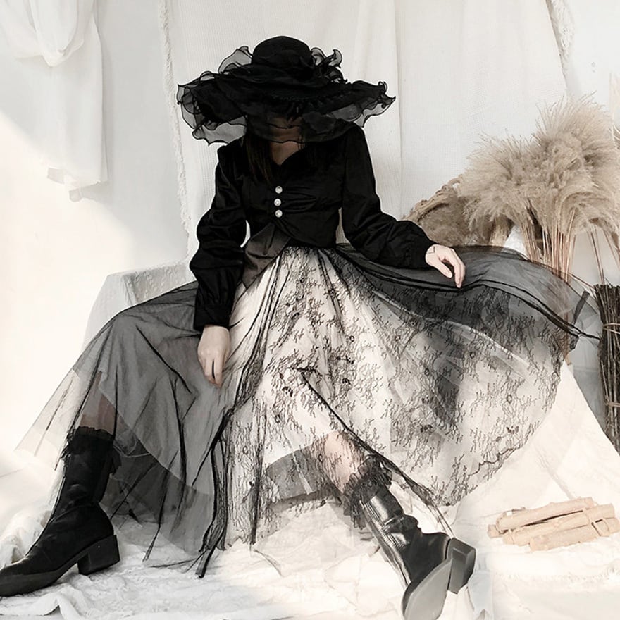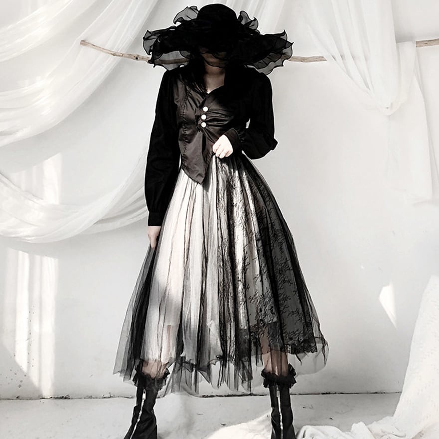 ゴシックファッションを好む方、素材の重なりや透け感を楽しみたい方、ボリュームのあるスカートを探している方。