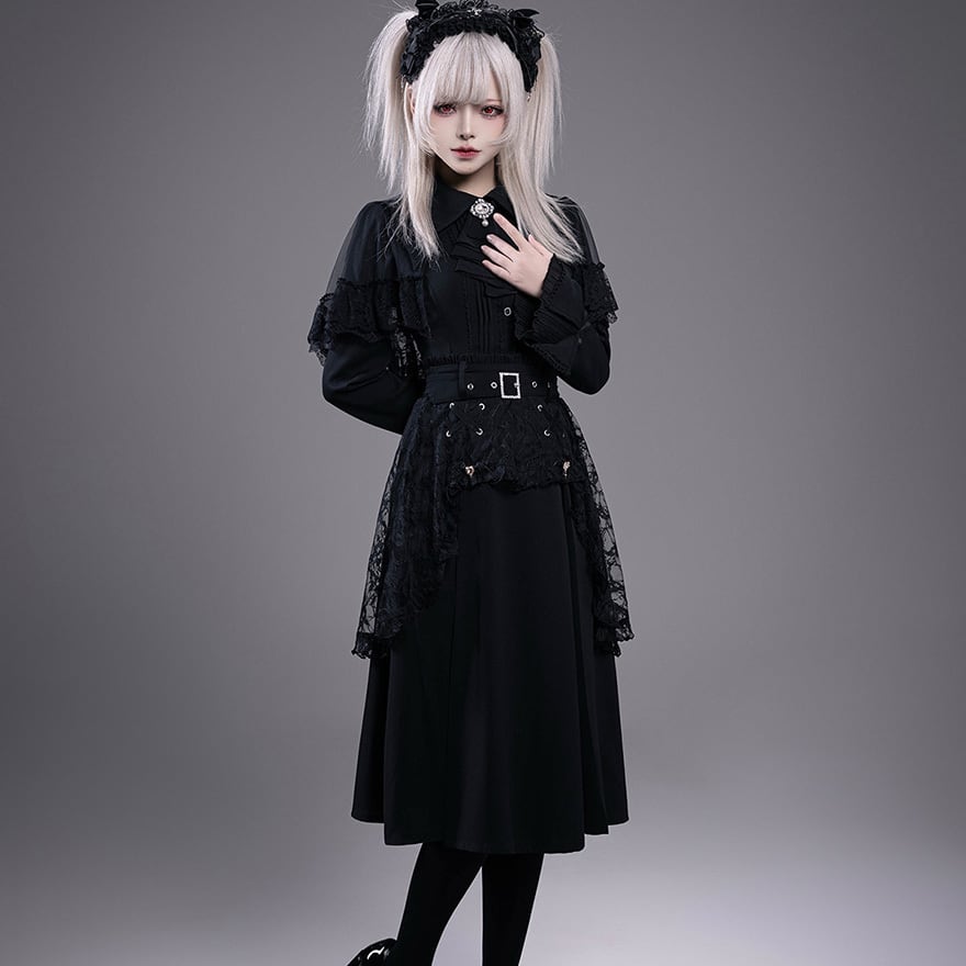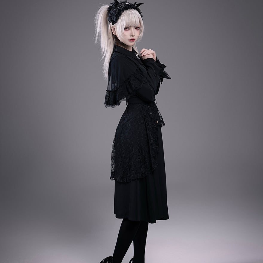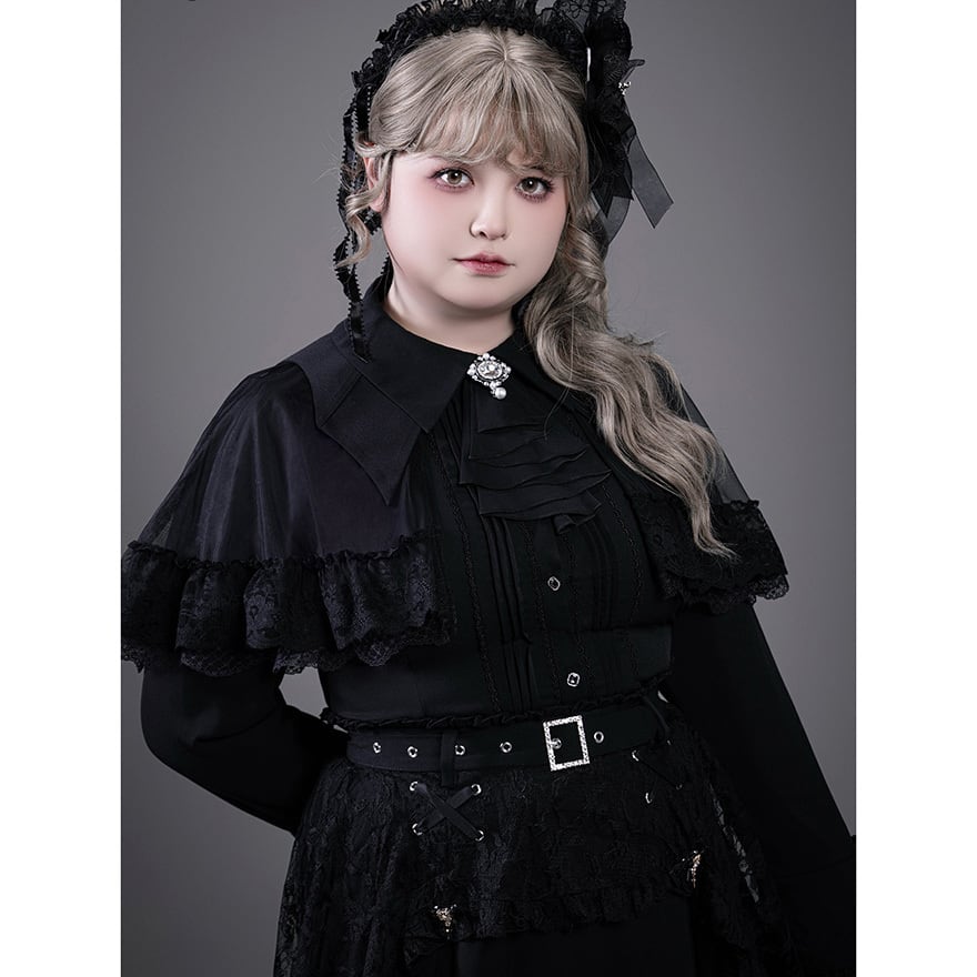 繊細なレースケープを纏ったような装飾と、取り外し可能なジャボタイが貴族的な気品を漂わせるデザインブラウス。袖口のプリーツフリルが手元を優雅に演出し、胸元のビジューがダークな黒に輝きを添えます。一着でレイヤード風の完成されたシルエットが手に入る、ゴシック・モード界隈必見のデコラティブな一着です。