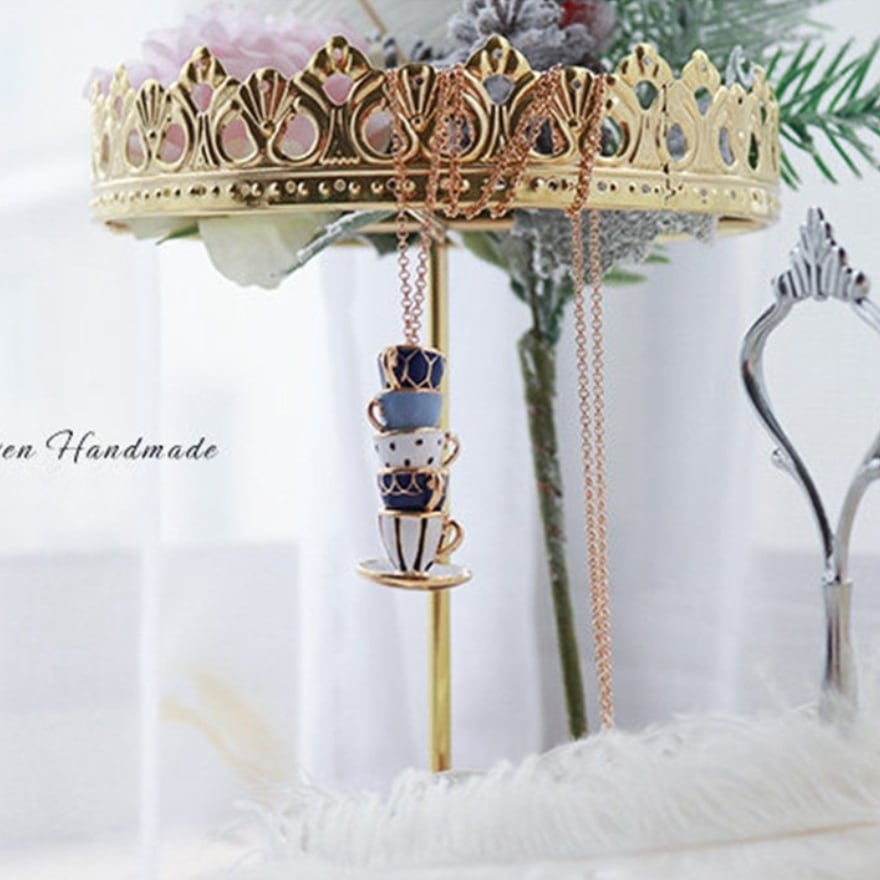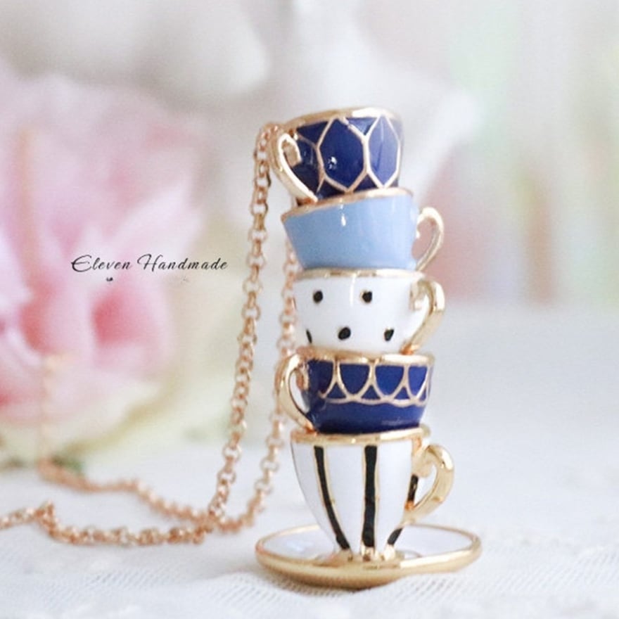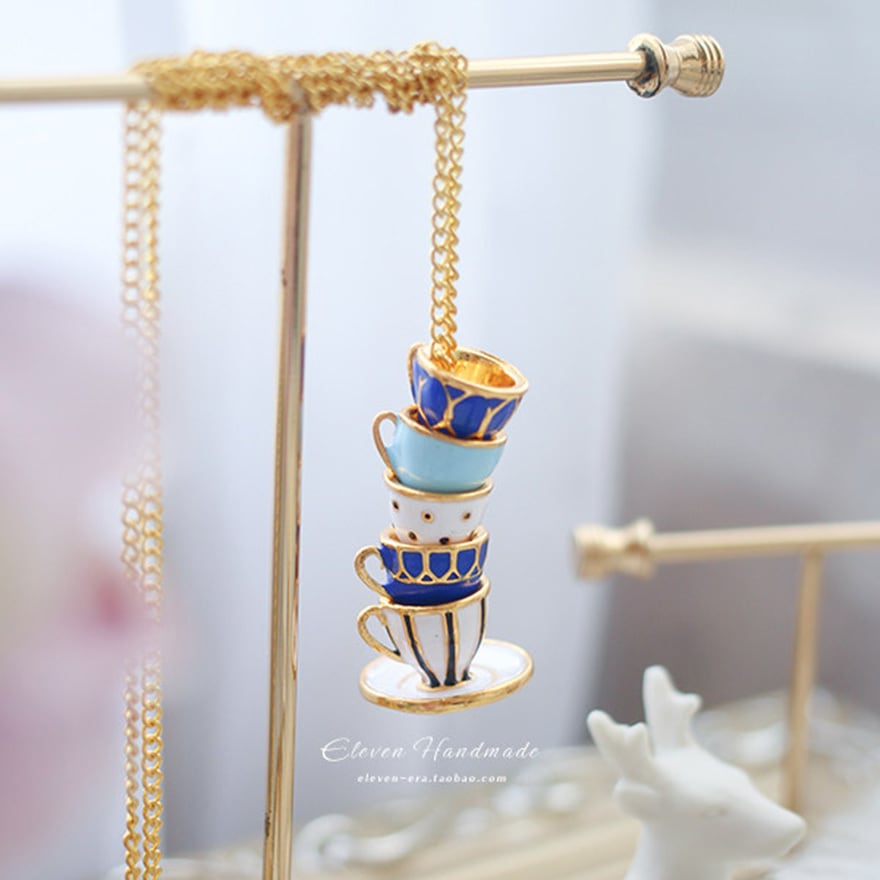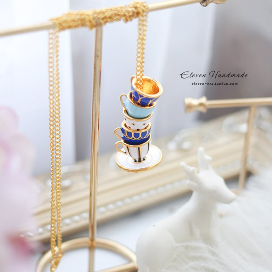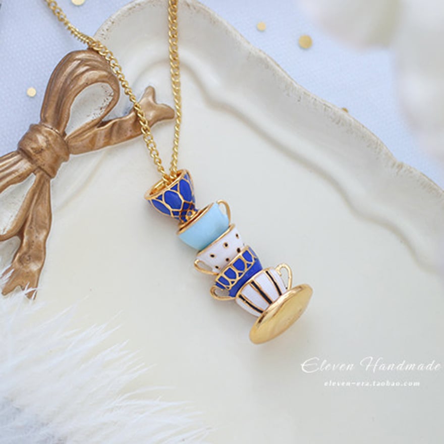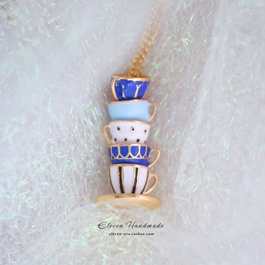 5段に重なるティーカップをそのままミニチュア化したエナメル彩色ペンダント。ネイビー・水色・白のアンティーク調カラーとゴールド縁取りがクラシカルロリータやアリス系コーデに絶妙にマッチ。お茶会・同人イベント・ロリータ集会など上品な場面のアクセントに最適な一品。