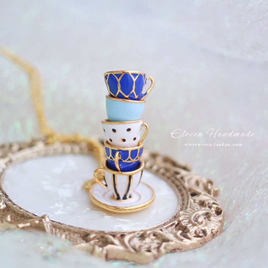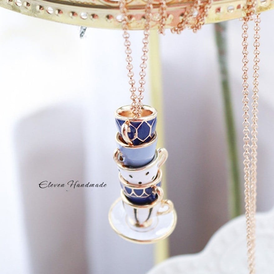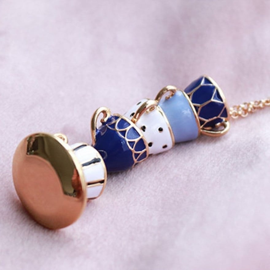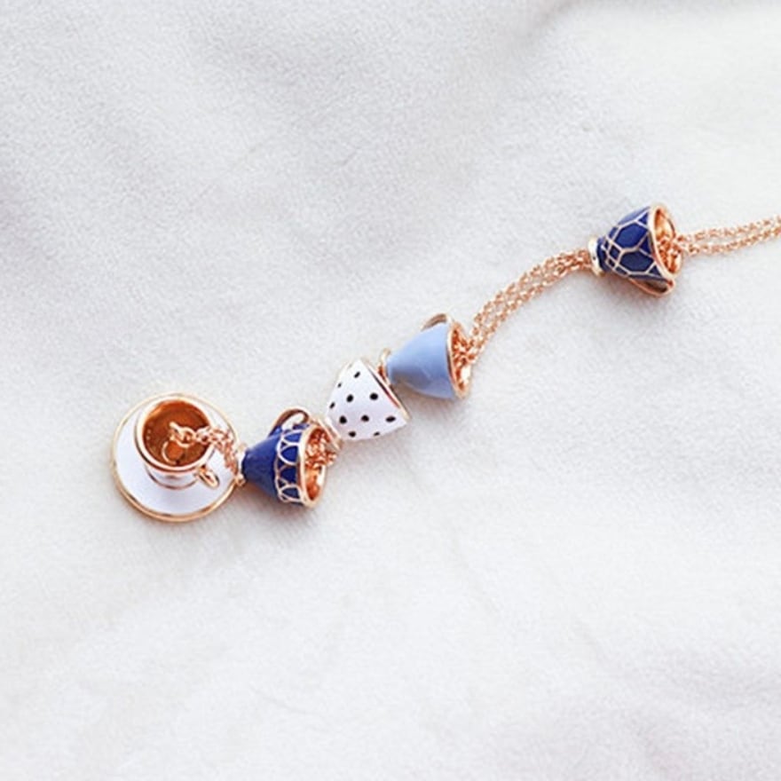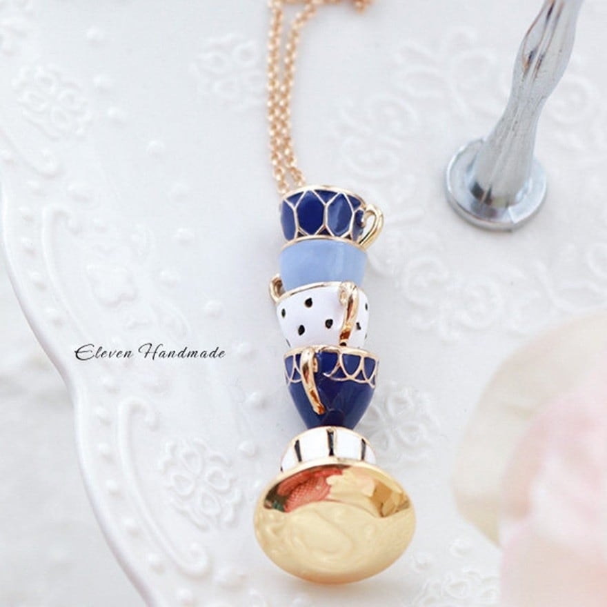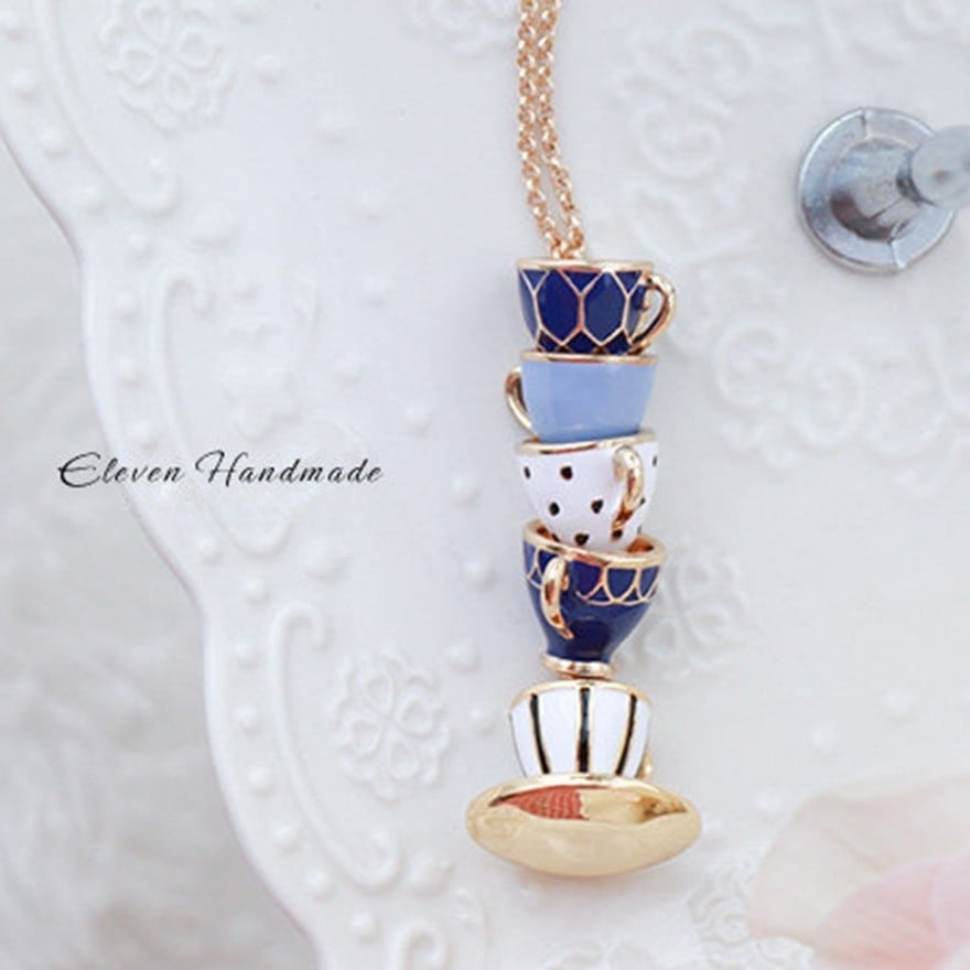 5段に重なるティーカップをそのままミニチュア化したエナメル彩色ペンダント。ネイビー・水色・白のアンティーク調カラーとゴールド縁取りがクラシカルロリータやアリス系コーデに絶妙にマッチ。お茶会・同人イベント・ロリータ集会など上品な場面のアクセントに最適な一品。