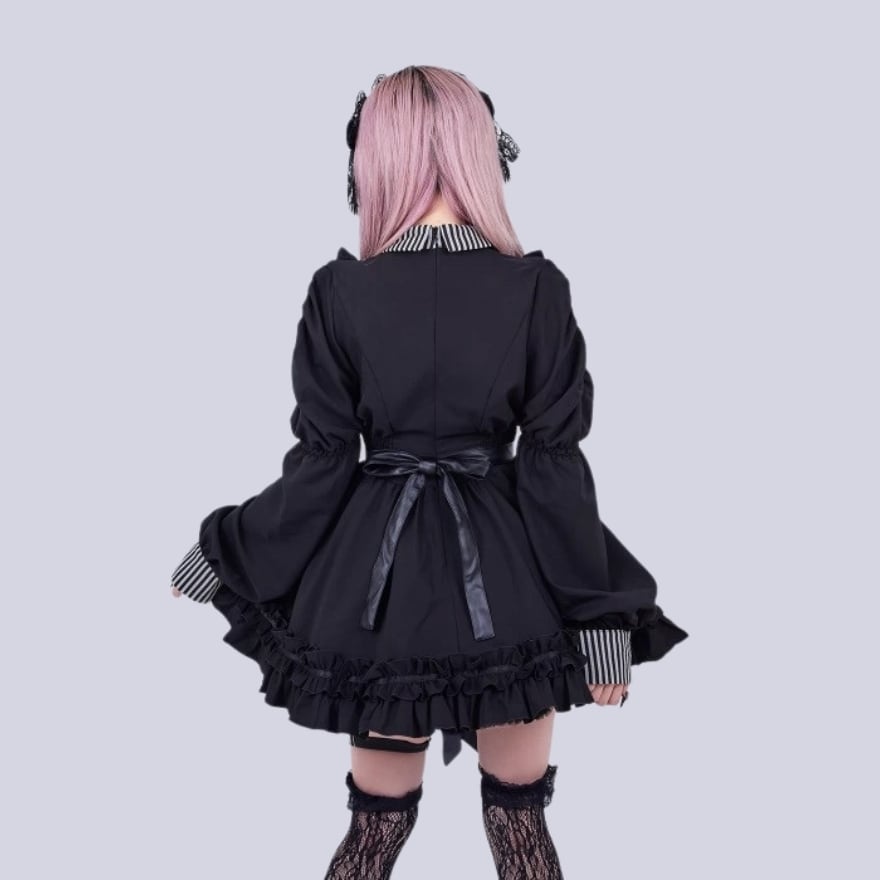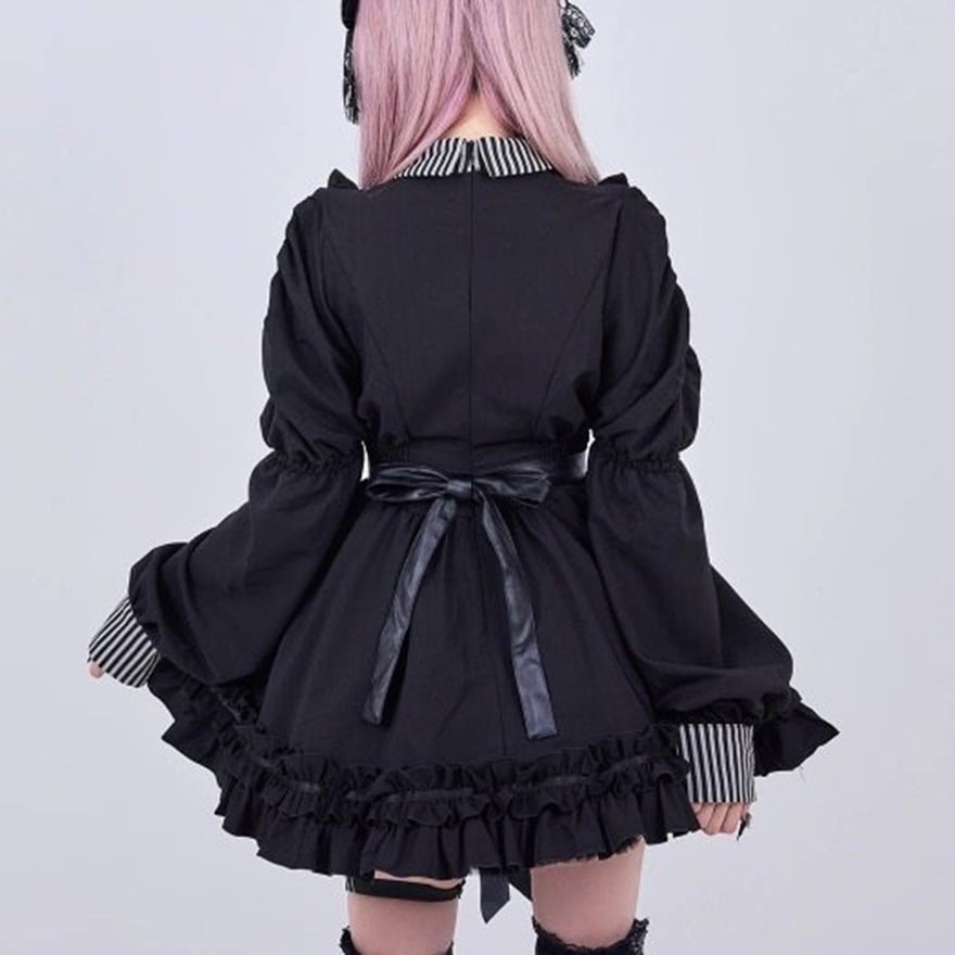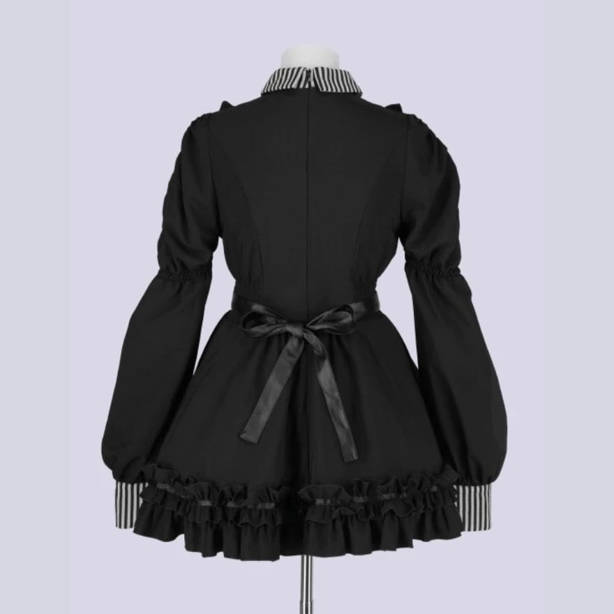 ゴシック寄りの世界観を反映した、黒色と縦縞模様の対比が印象的な長袖ワンピースです。
