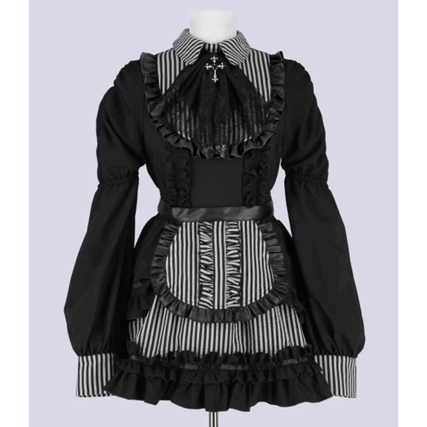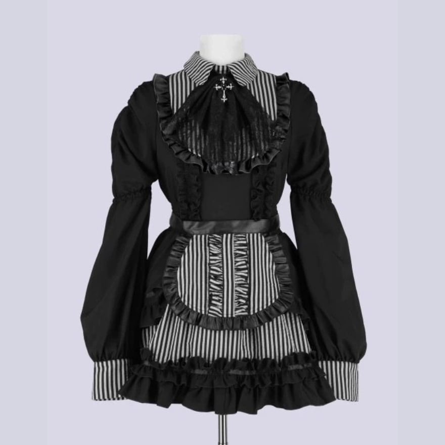 黒色の無地生地と、白黒の縦縞模様の生地を組み合わせています。胸元には黒いレースの装飾と銀色の十字架チャーム、襟元と袖口には縦縞の切り替えがあります。