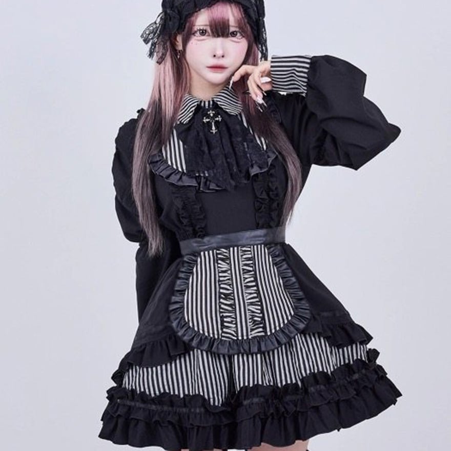 クラシカルなメイド服を基調としつつ、首元の十字架チャームや多層のフリル、ボリュームのあるパフスリーブを配しています。