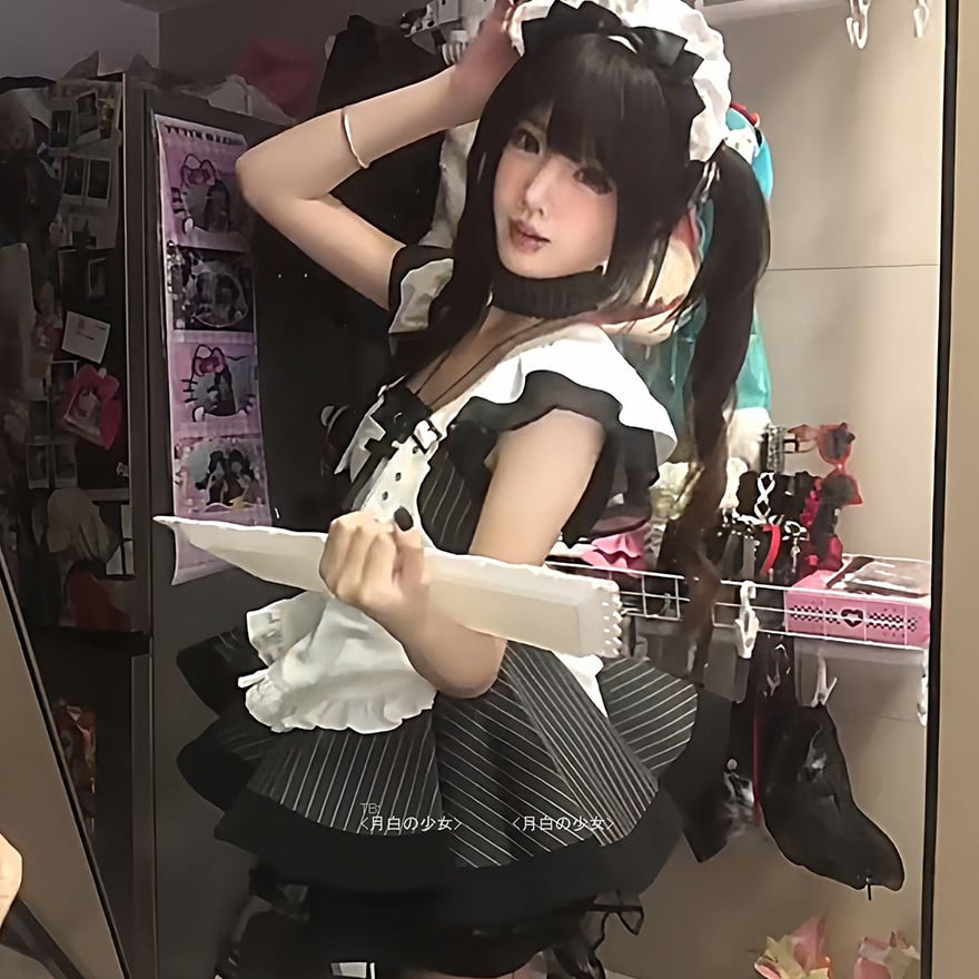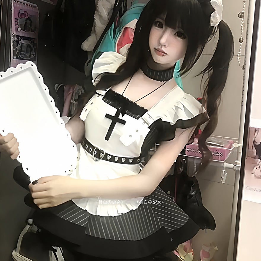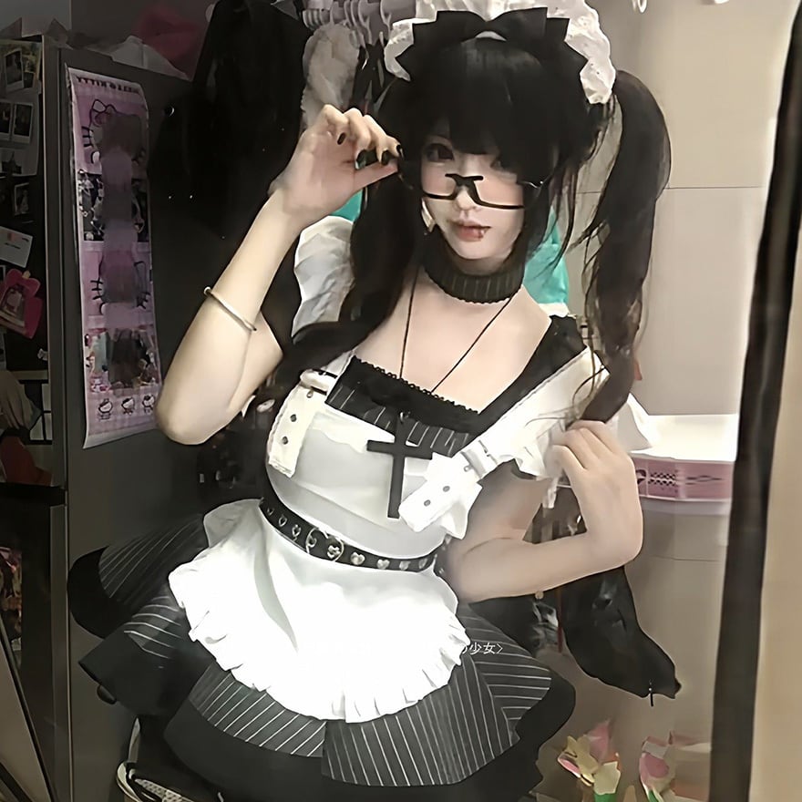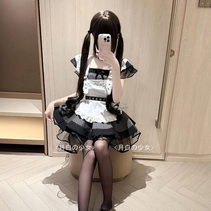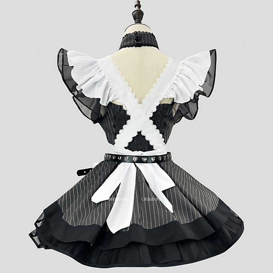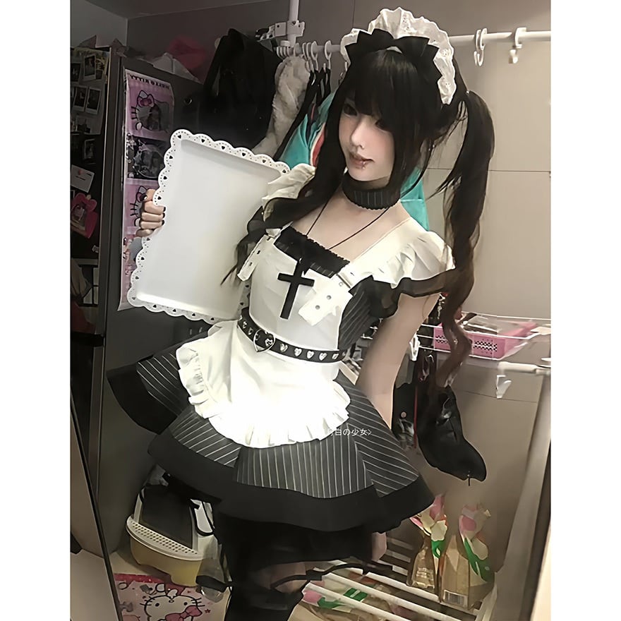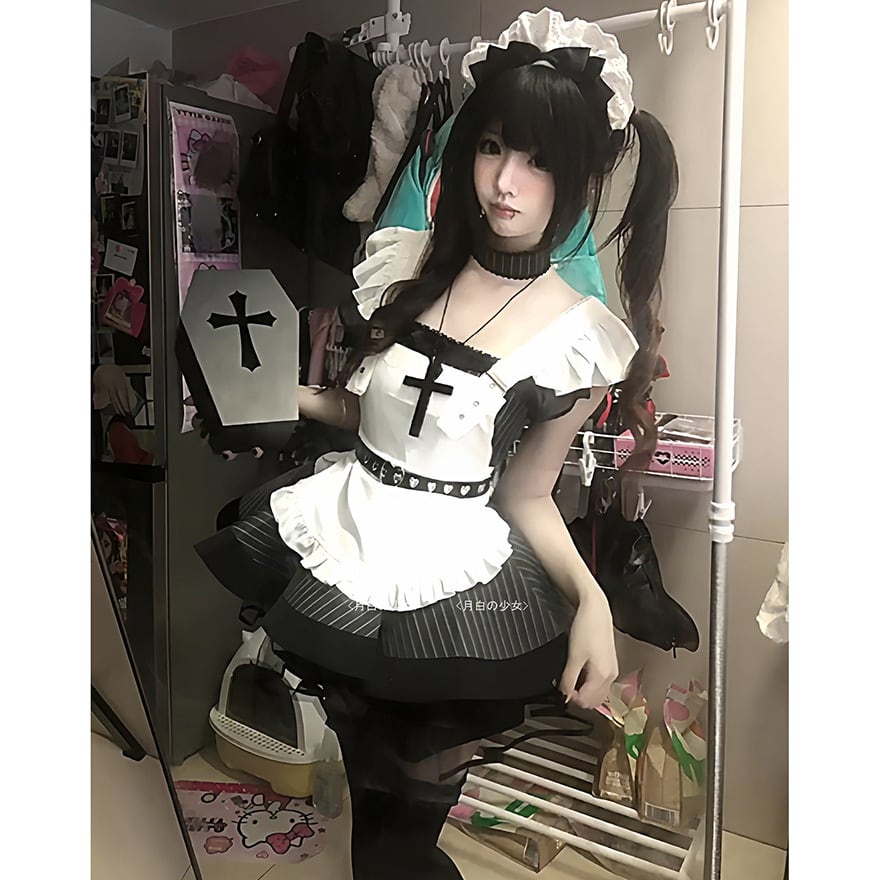 地雷系ジャンルの代表的な要素である黒白の配色と、メイド服の意匠を融合させた装飾性の高いメイドセットです。
