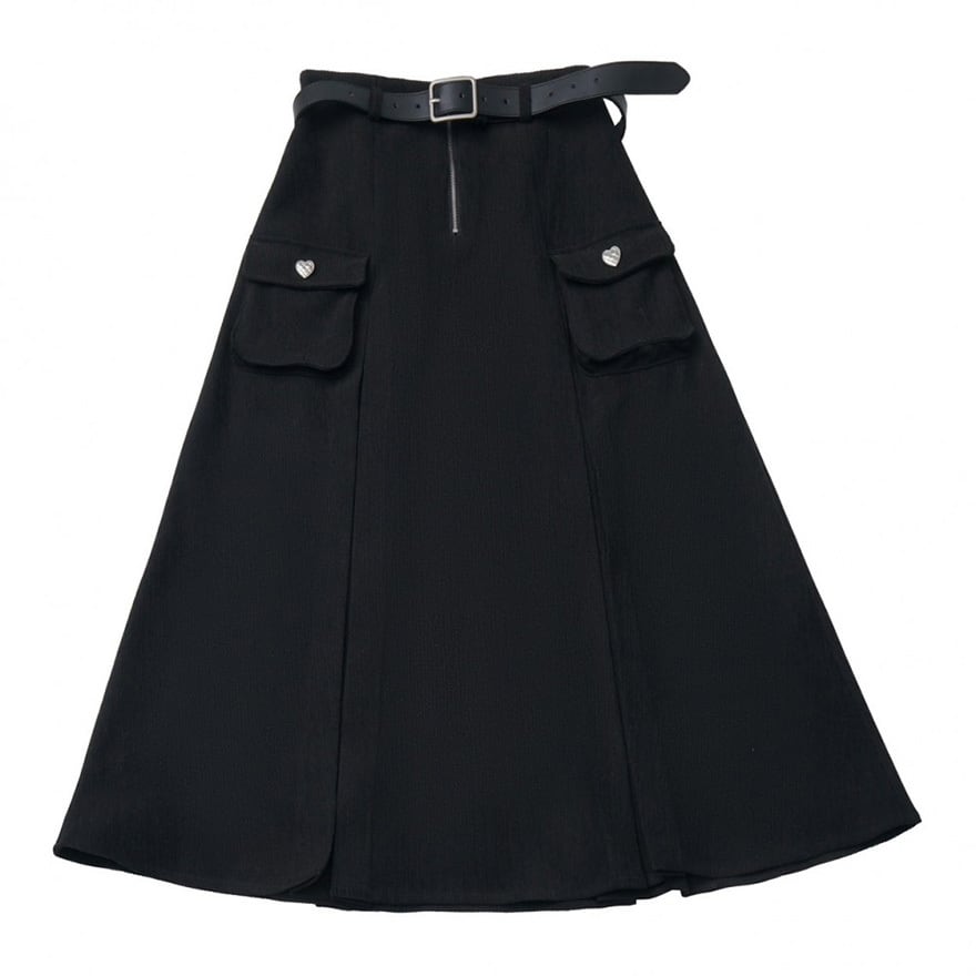 ハイウエストのデザインに前面の垂直ファスナーと、ハート型のボタンを配した左右のポケットが特徴です。