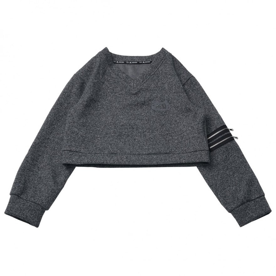全体は杢調の灰色で、首元は緩やかなVネック形状です。左上腕部に黒いライン状のジッパー装飾が三段並んでおり、胸元には目立ちにくい同系色のロゴ刺繍があります。