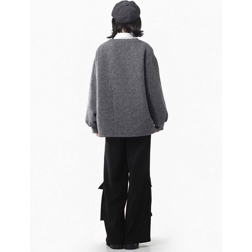 ゆったりとした袖のシルエットと、重ね着しやすい首元の形状を兼ね備えており、独自のモード感を演出できる実用的な一着です。