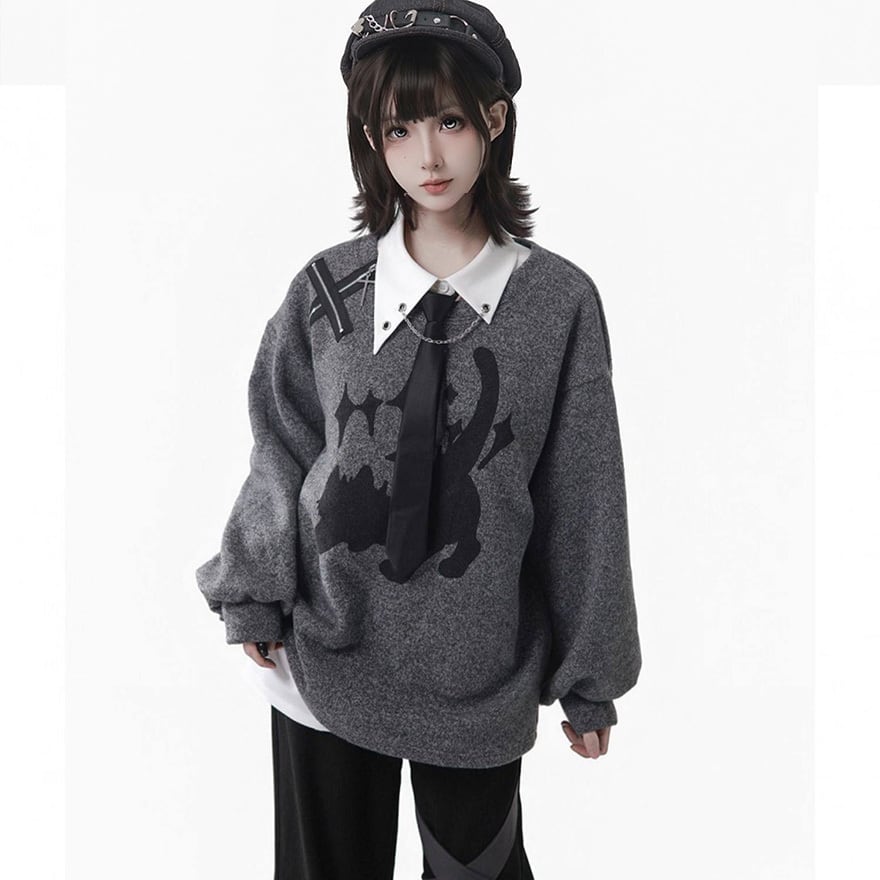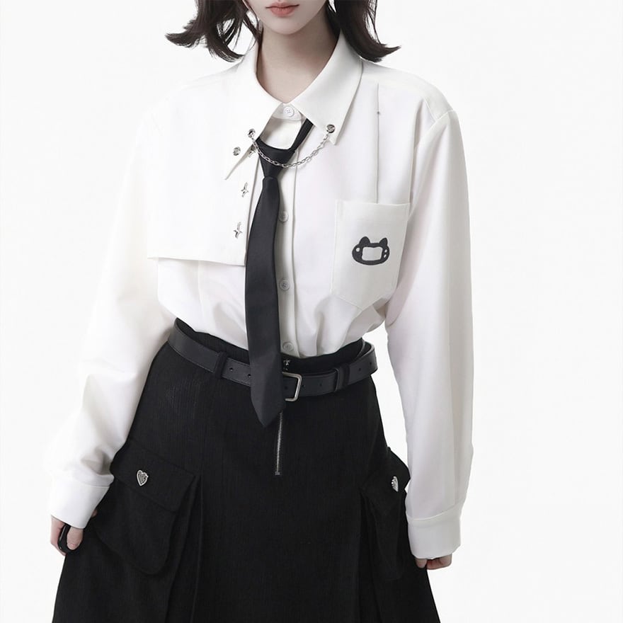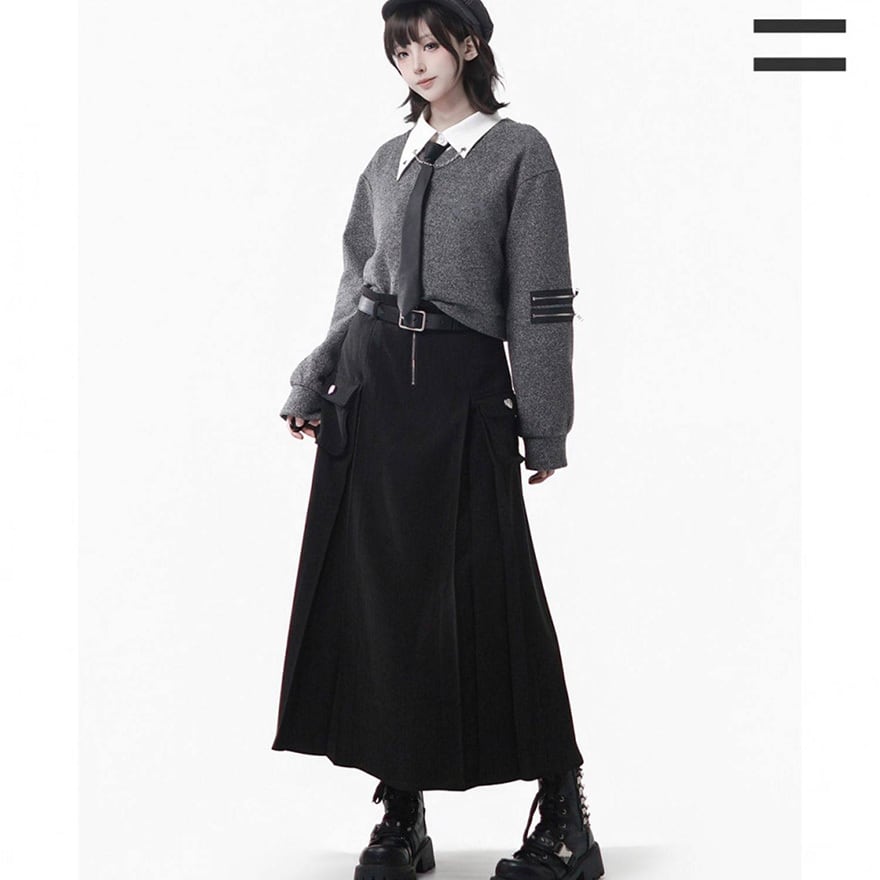 全体は無地の黒色生地で、左腿に灰色のクロスベルトと銀色のスタッズ装飾が施されています。
