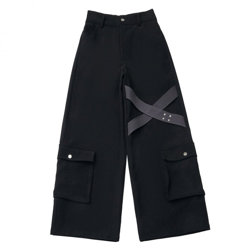 太もものクロスベルトがエッジを効かせる、最旬のワイドカーゴパンツ。ボリュームのあるシルエットに、スタッズ付きのサイドポケットが武骨なパンク感をプラスします。地雷系・V系スタイルはもちろん、オーバーサイズのトップスと合わせたストリートコーデにも最適。性別を問わず楽しめるモードな一着です。