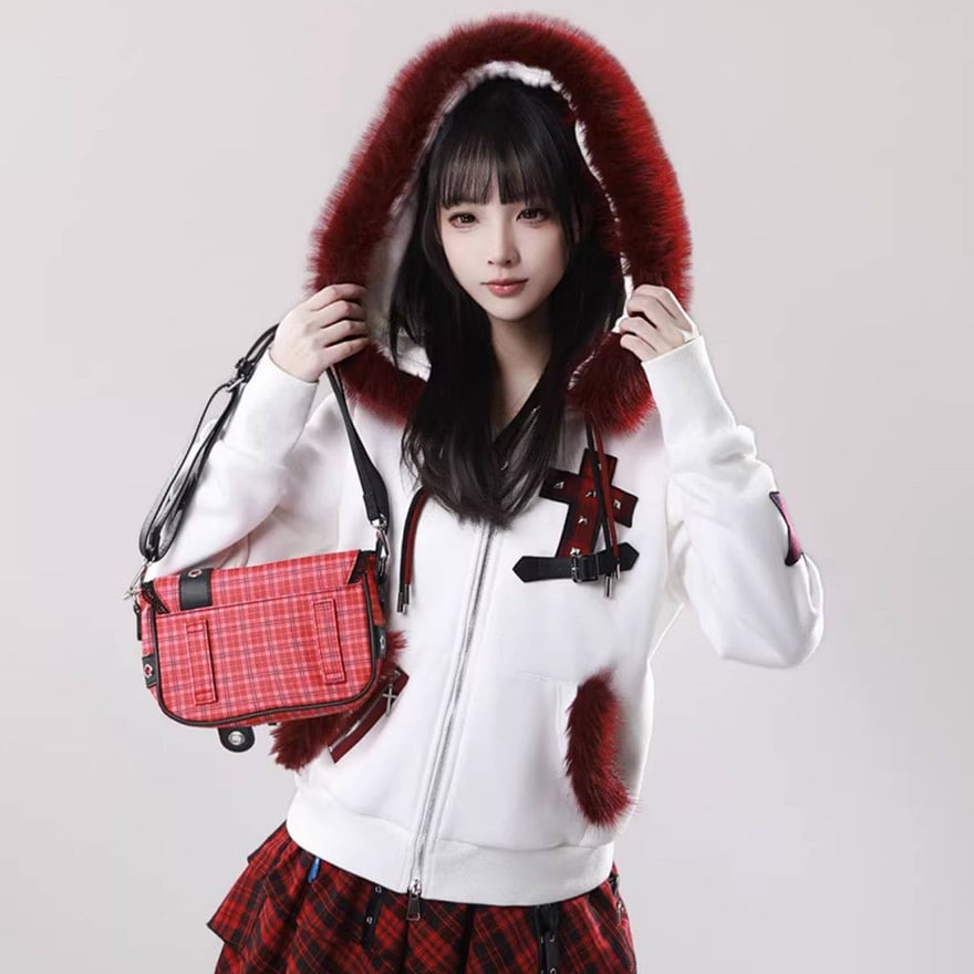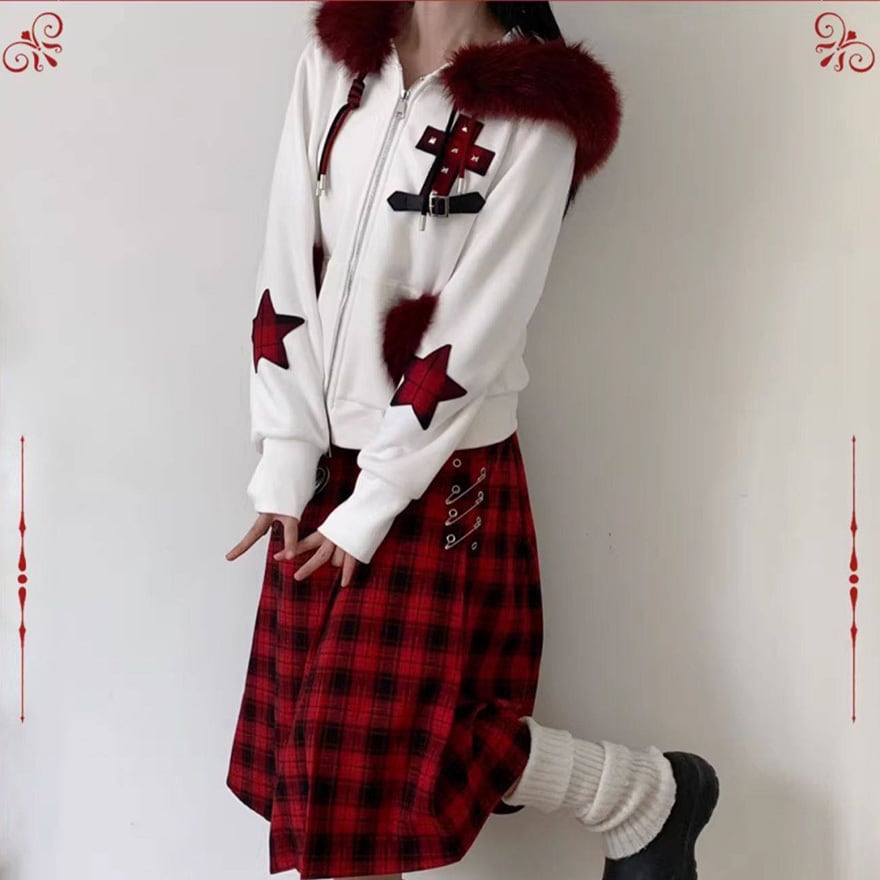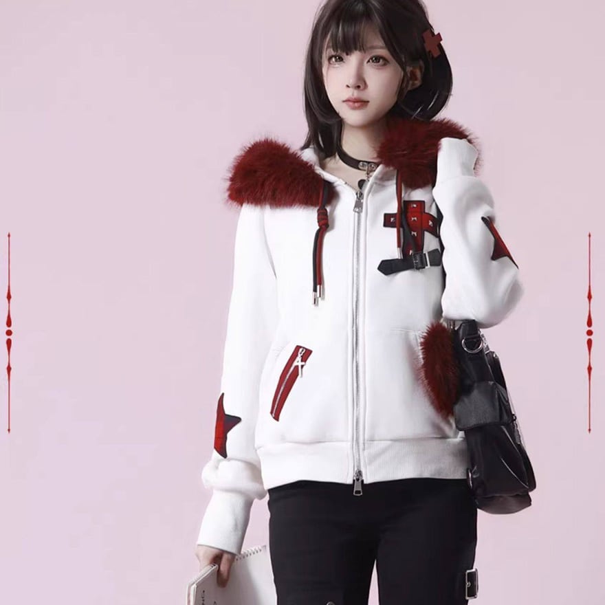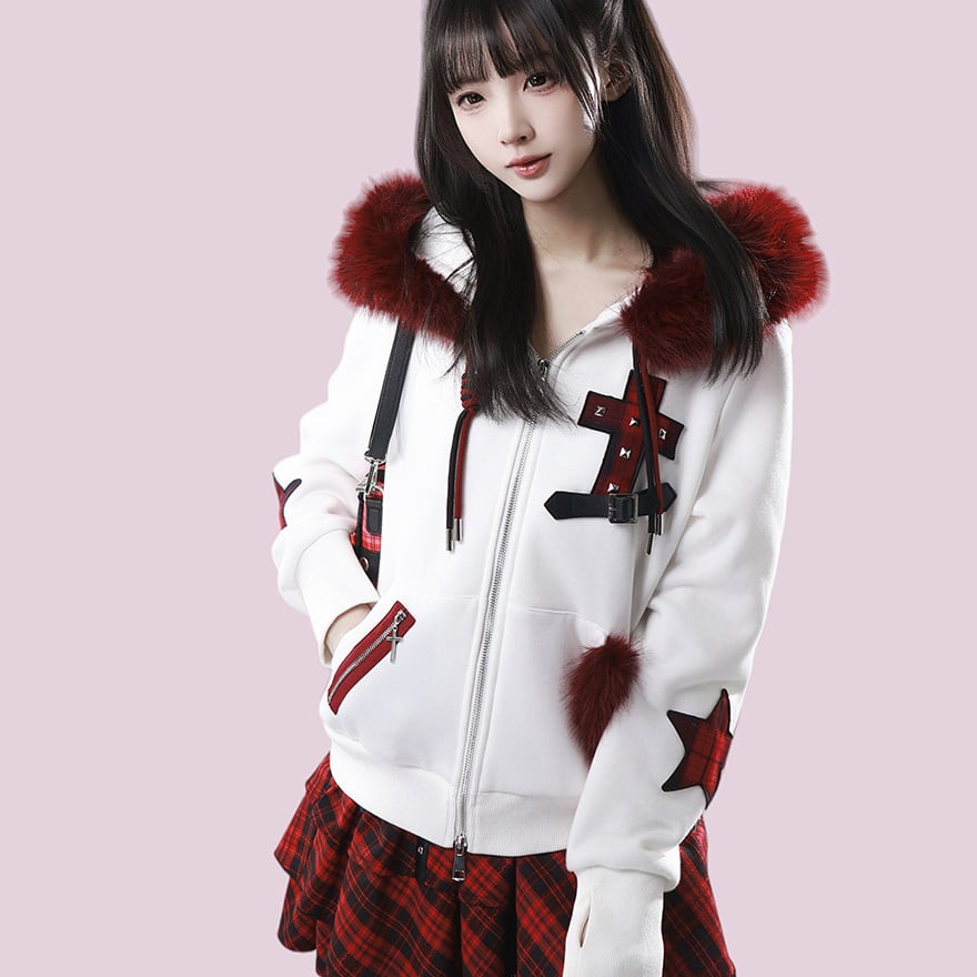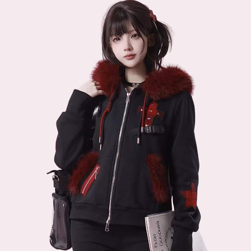 袖を通した瞬間、赤と黒の鮮烈なコントラストがあなたの個性を引き立てます。フードを被れば真っ赤なファーが顔周りを華やかに見せ、星型のパッチやベルト装飾が、どこから見ても隙のない「パンクで可愛い」理想のシルエットを演出。周囲と差がつくスタイルで、街歩きもSNSの投稿も最高に楽しくなるはずです。