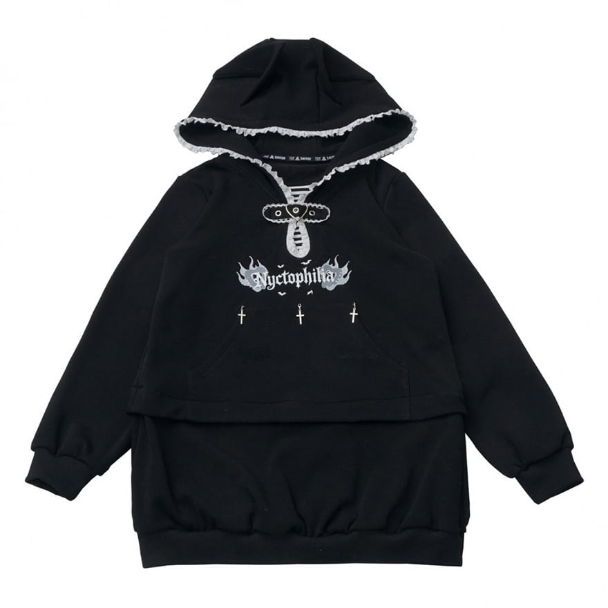 フードには本体と同色の猫耳型のパーツが付いています。胸元には白い英字ロゴのプリントがあり、その下には銀色の十字架型チャームが3つ付いています。