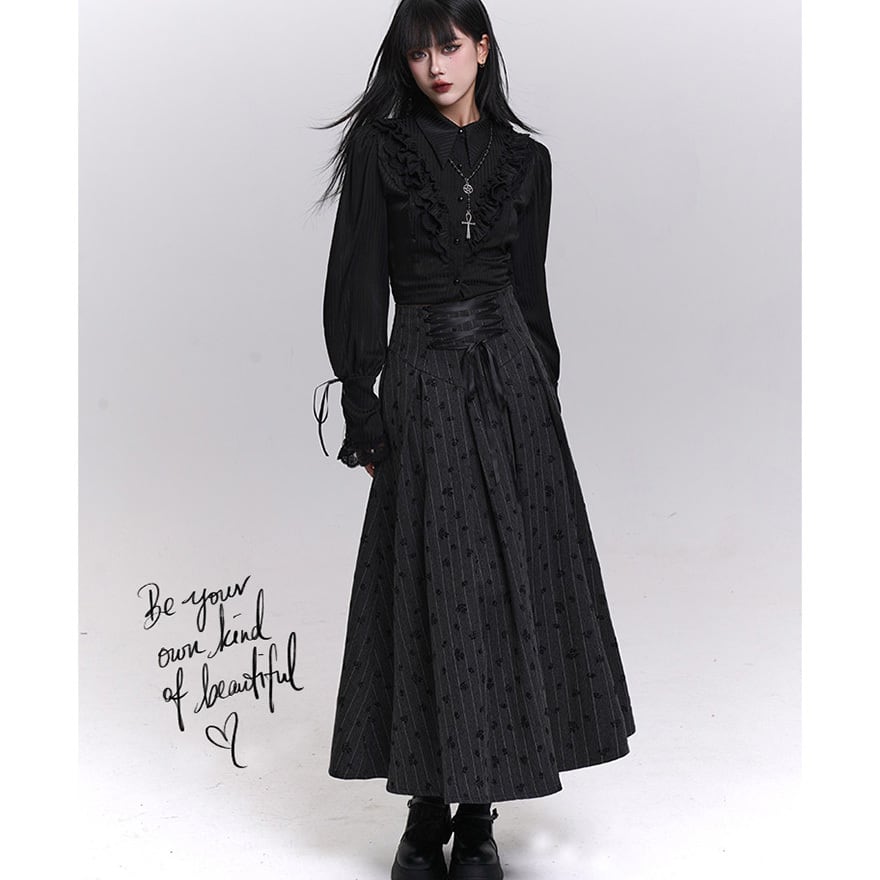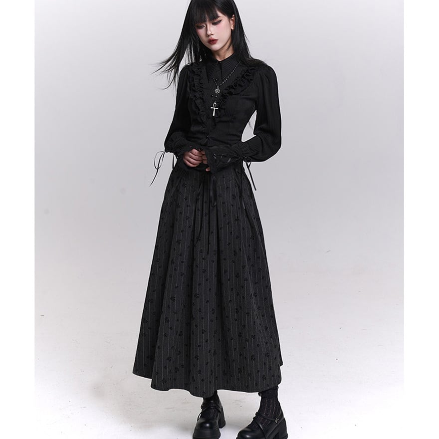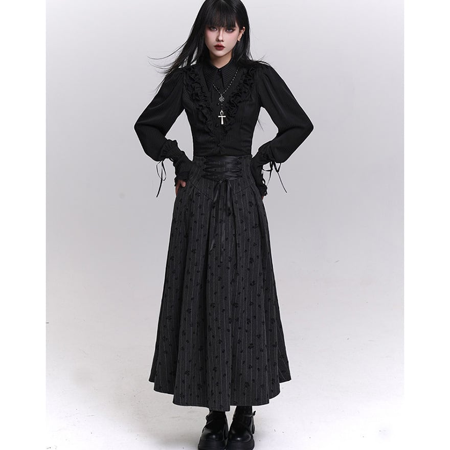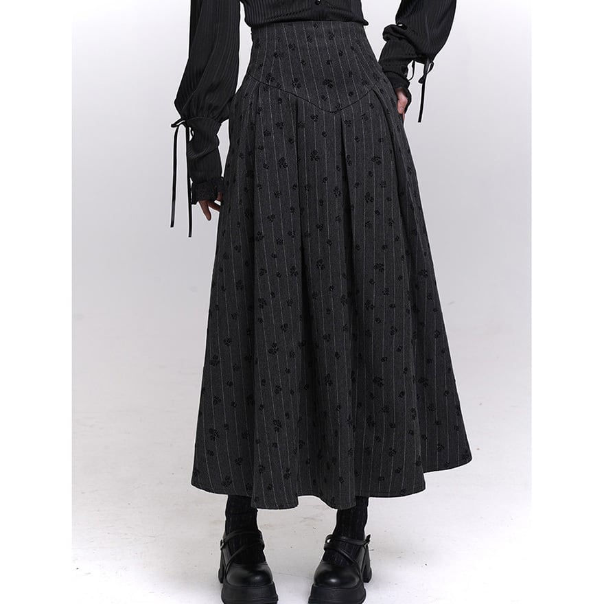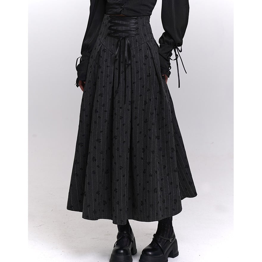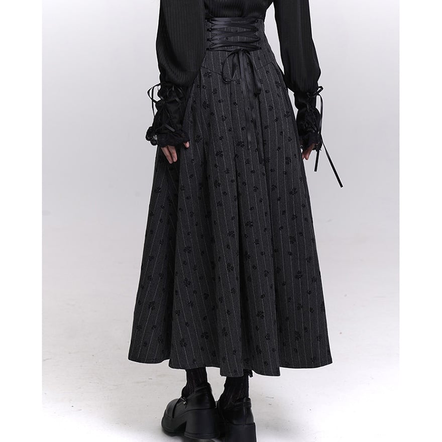ゴシック調 編み上げウエスト ロングスカート|ストライプ×小紋柄・フレアシルエット