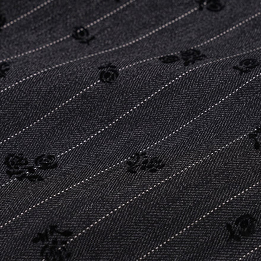 色は暗灰色を基調とし、黒の細い垂直な縞模様と、小さな植物のような模様が全体に配置されています。