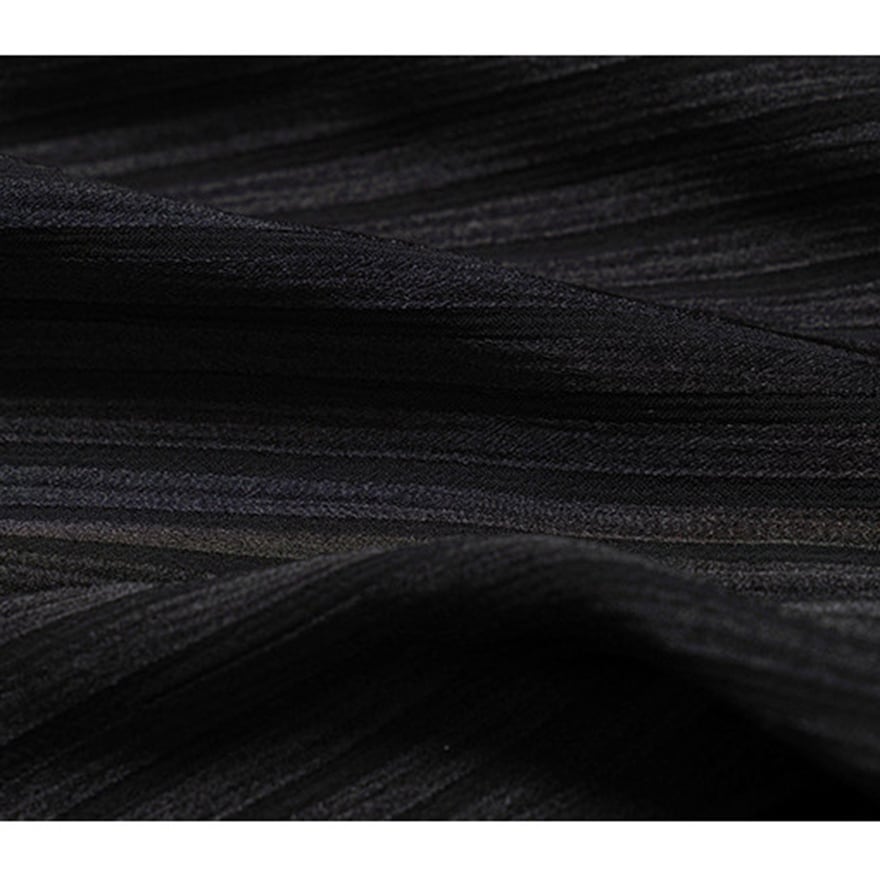 黒色の生地を使用し、胸元の中心から襟にかけて大ぶりなフリルが配置されています。フロントは黒色のボタン留め仕様です。
