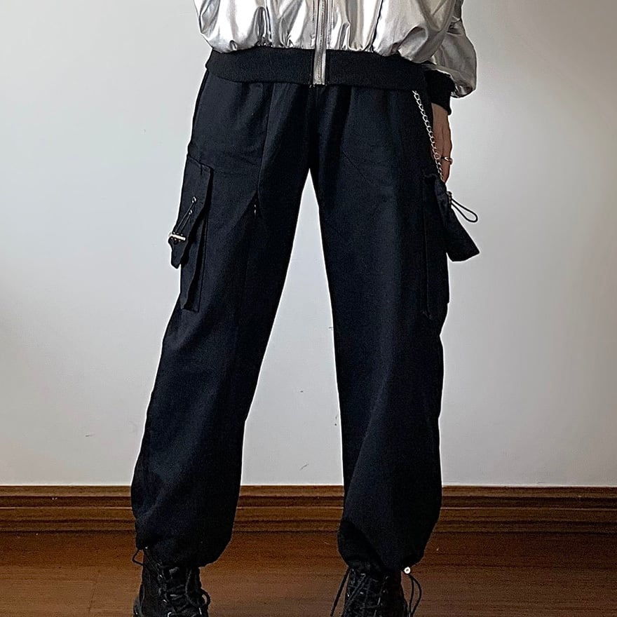 パンツは黒色の布帛素材で、左右にマチのある大きなカーゴポケットを備えています。パンツの裾には太さを調節できる紐が付属しています。