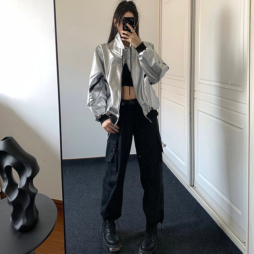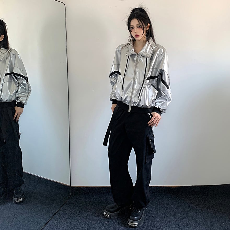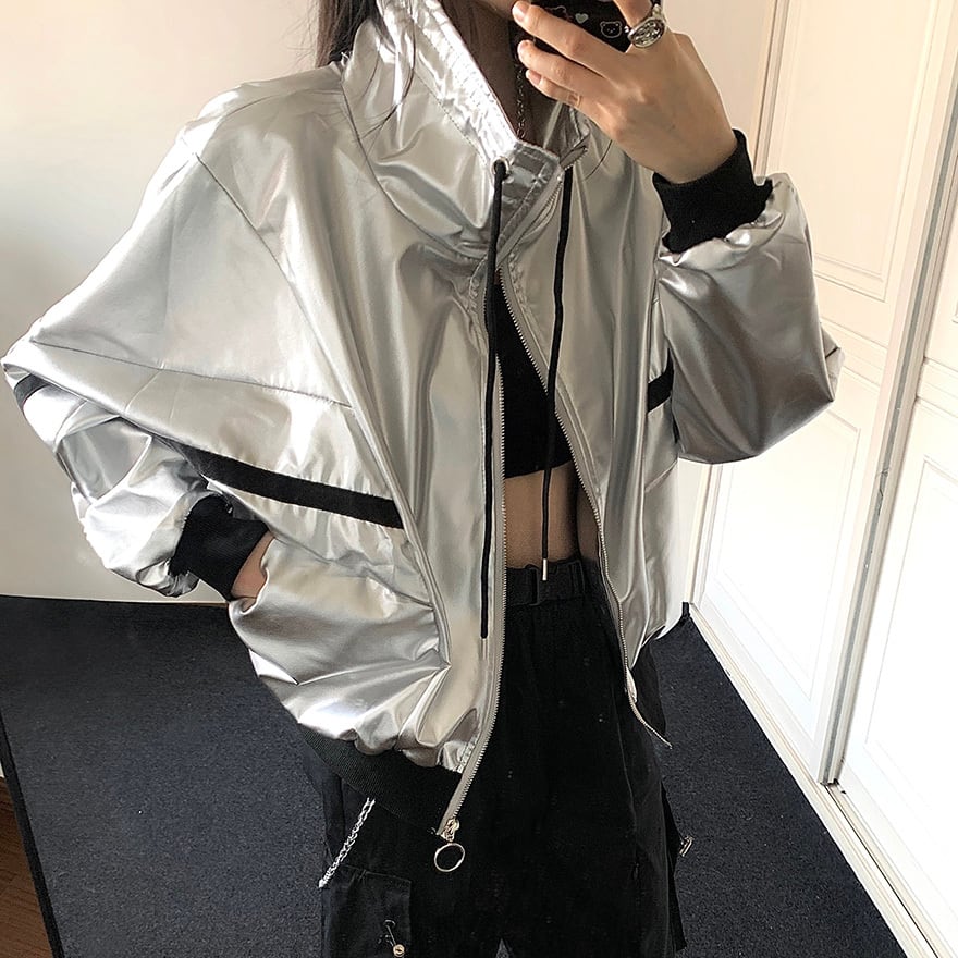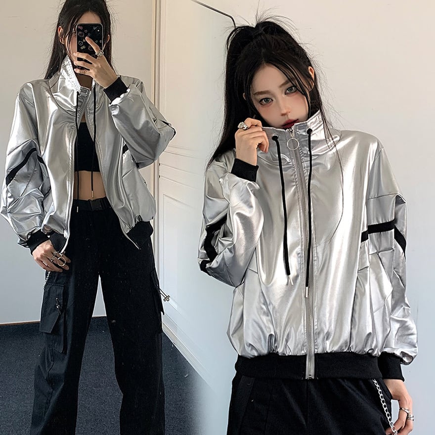 ジャケットは銀色のメタリック生地を使用し、高い光沢があります。