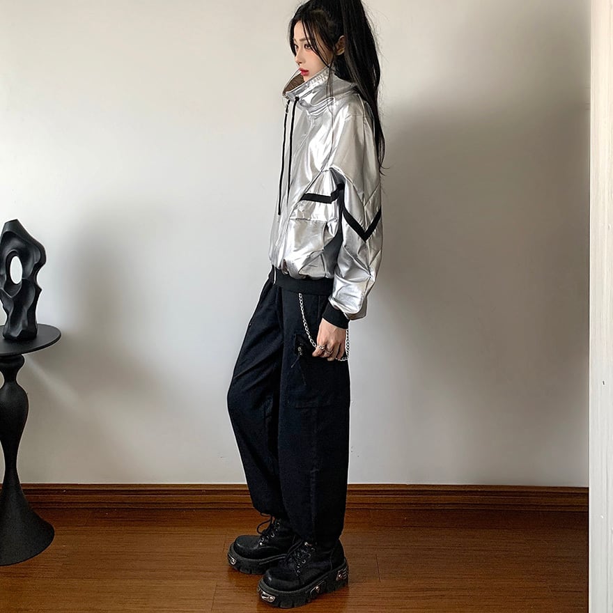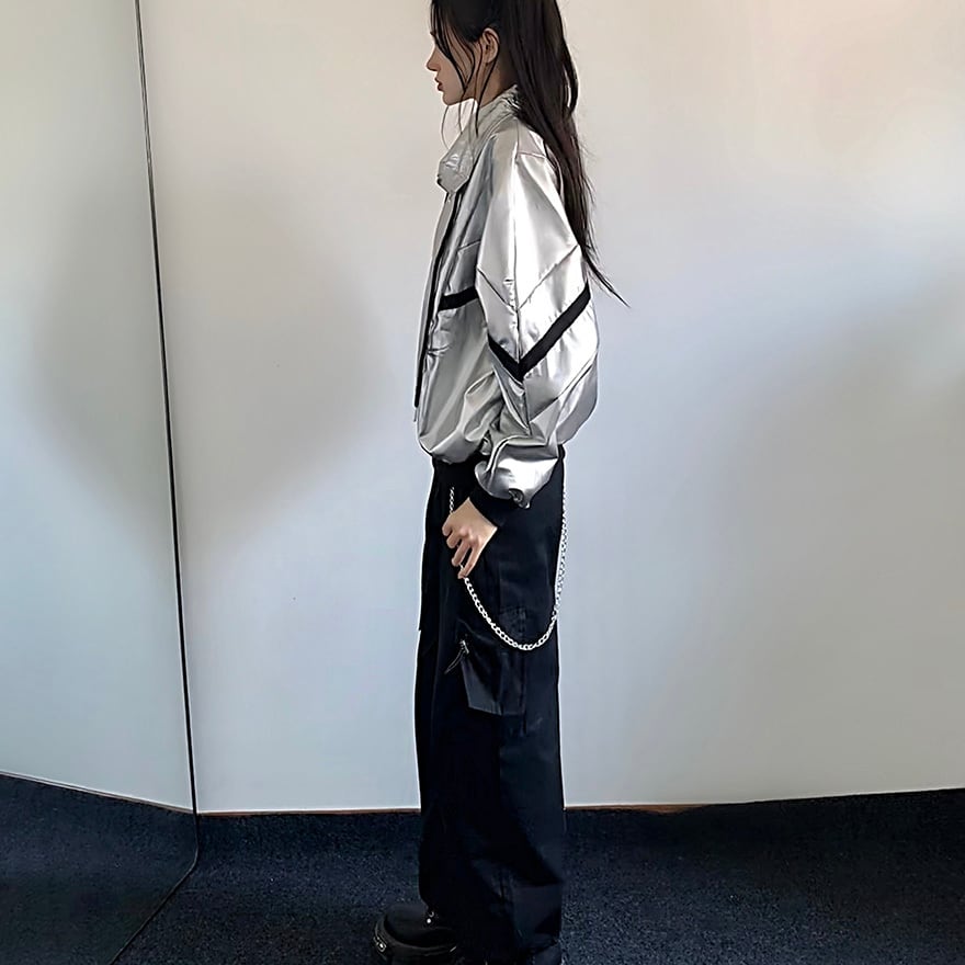 ジャケットの銀色に対し、パンツやリブ部分に黒を配置することで視覚的なバランスを整えています。