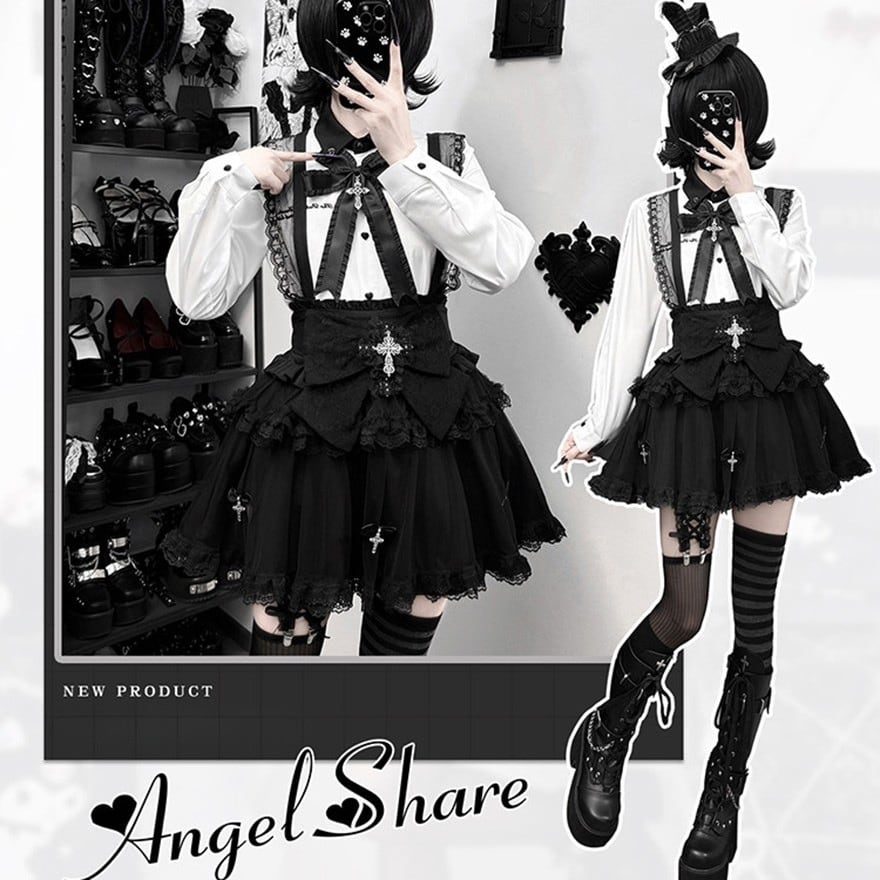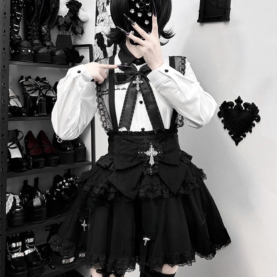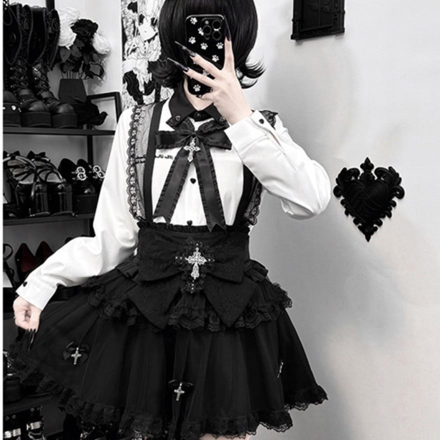 ボタンは立体的なハート型を採用。首元にはフリル付きの大きな黒リボンと、銀色の十字架ペンダントが配置されています。