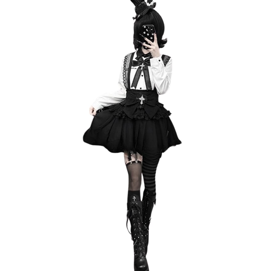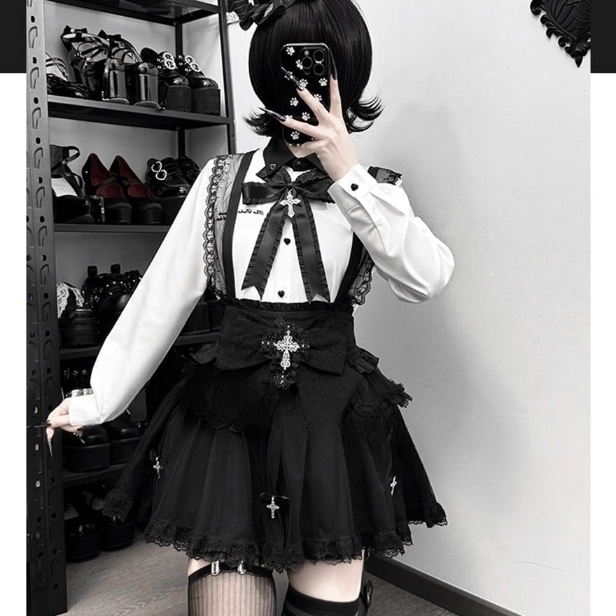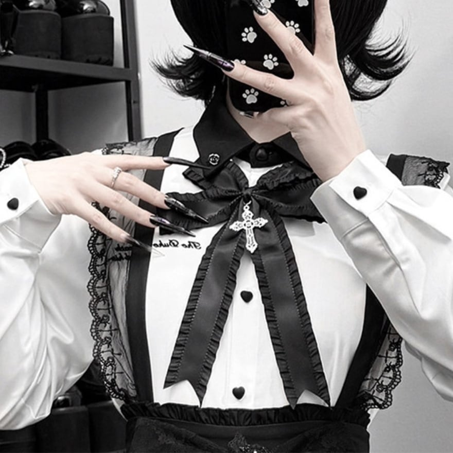 胸元に大胆なV字型のフリルと、中央に配置された大きなリボン、十字架(クロス)モチーフのチャームが特徴的なゴシックブラウスです。