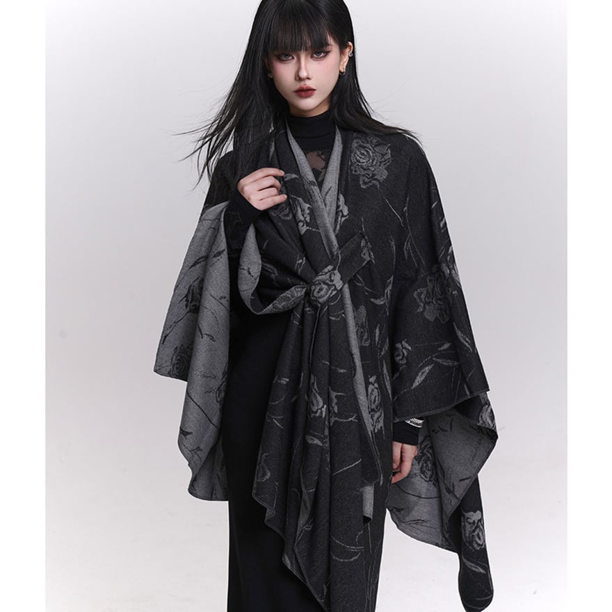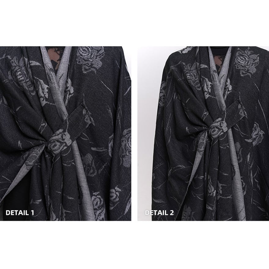 深みのある漆黒のコントラストが美しい、リバーシブル風の大判ショールポンチョです。