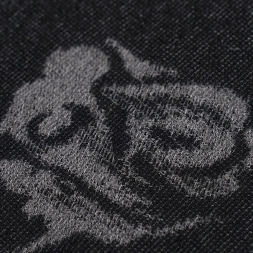 黒色の下地に、暗灰色で細部まで描き込まれた薔薇と棘のある蔓の模様が全体に広がっています。リバーシブルのように色が反転して見える織り構造です。