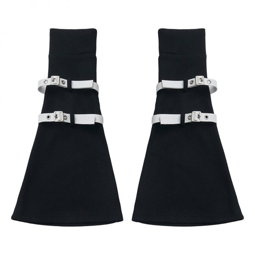 裾に向かって大きく広がるフレアシルエットが特徴的な、黒のレッグカバーです。