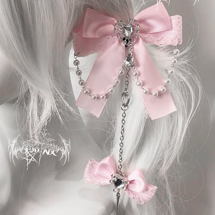 リボン中央にはラインストーンで縁取られたハート型の透明パーツが固定されています。鎖の先端には小型の同デザインのリボンと、円錐状の金属パーツが付属しています。