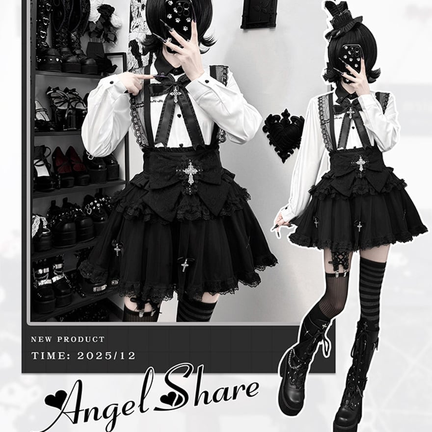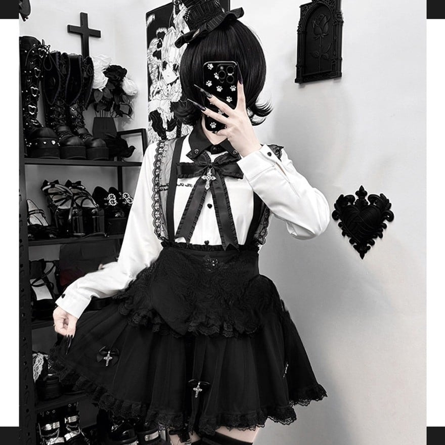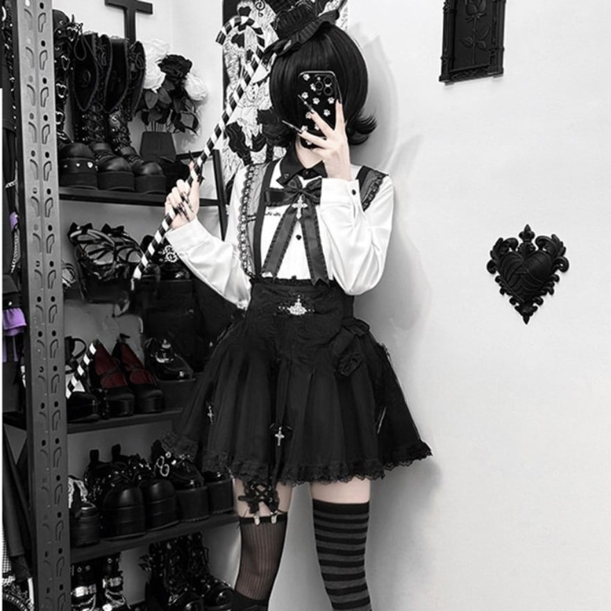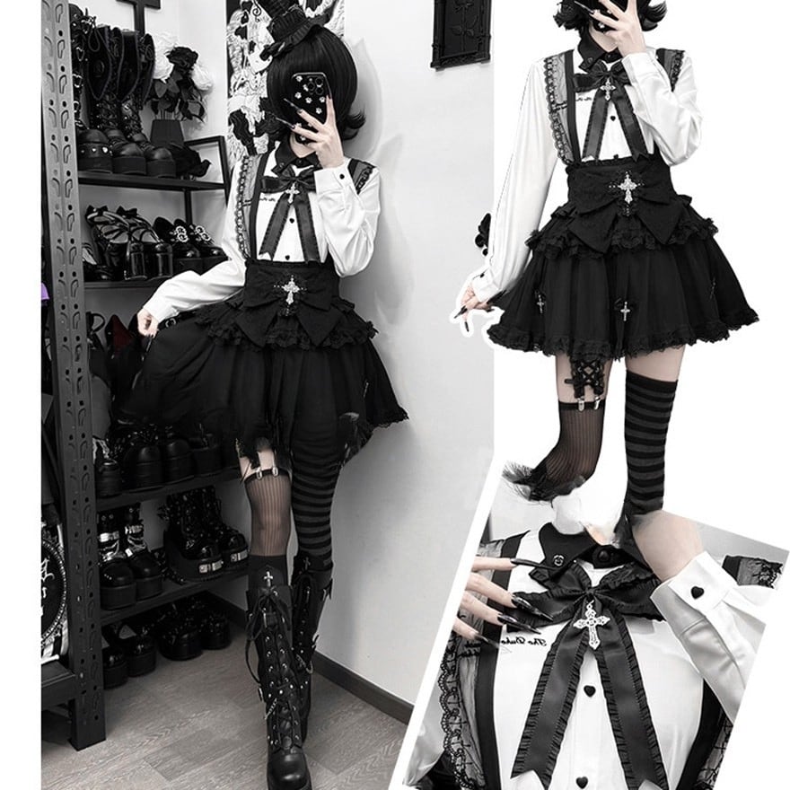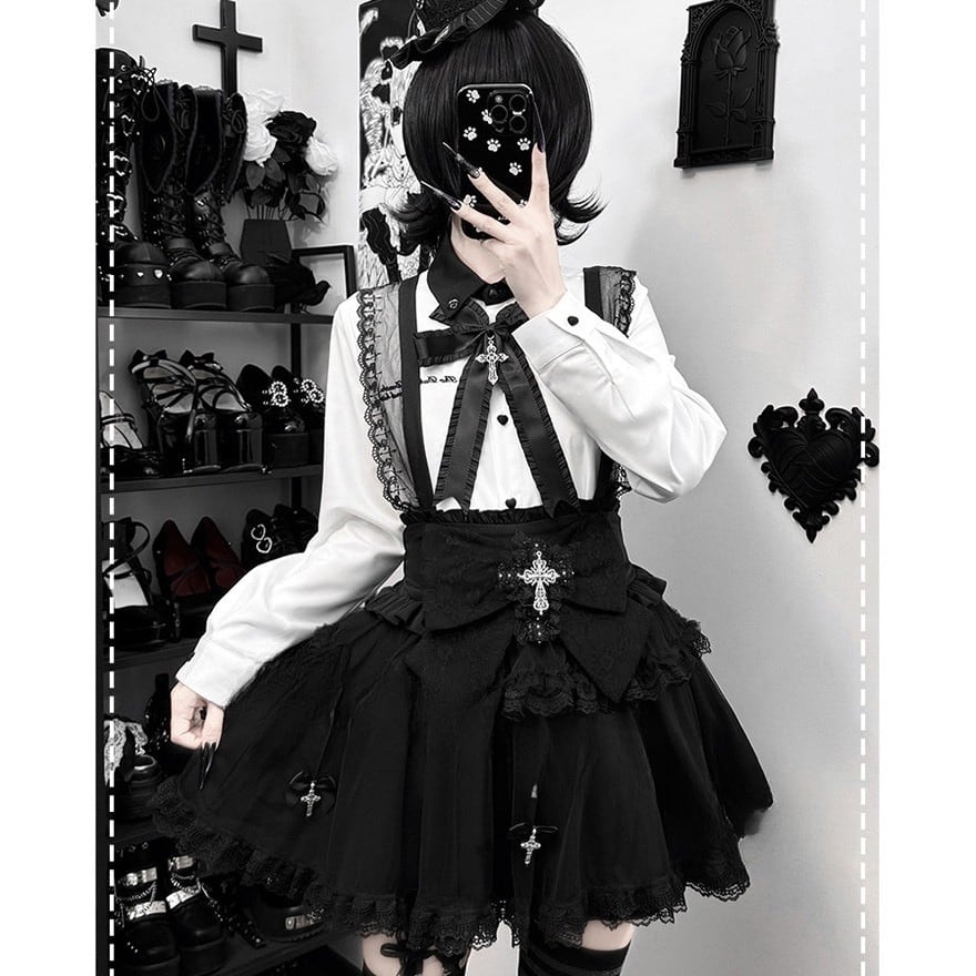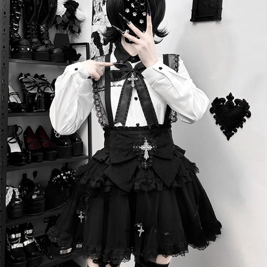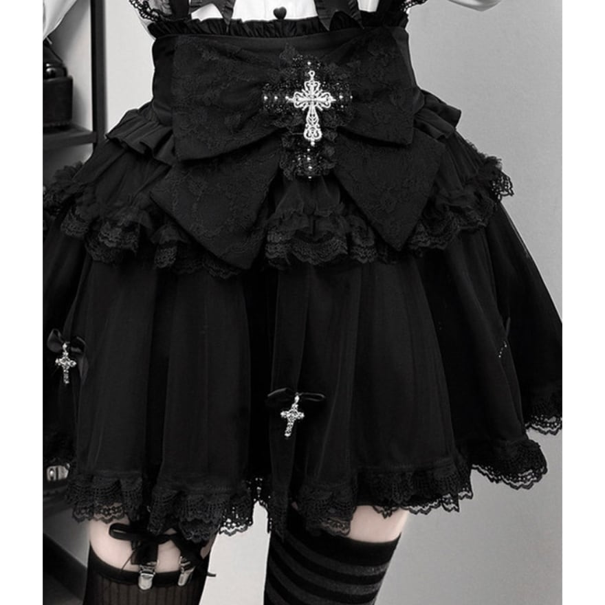 ウエスト正面には大ぶりのレースリボンがあり、中央に銀色の装飾付き十字架チャームを配置。スカートの裾付近にも小さなリボンと十字架チャームが複数垂れ下がっています。