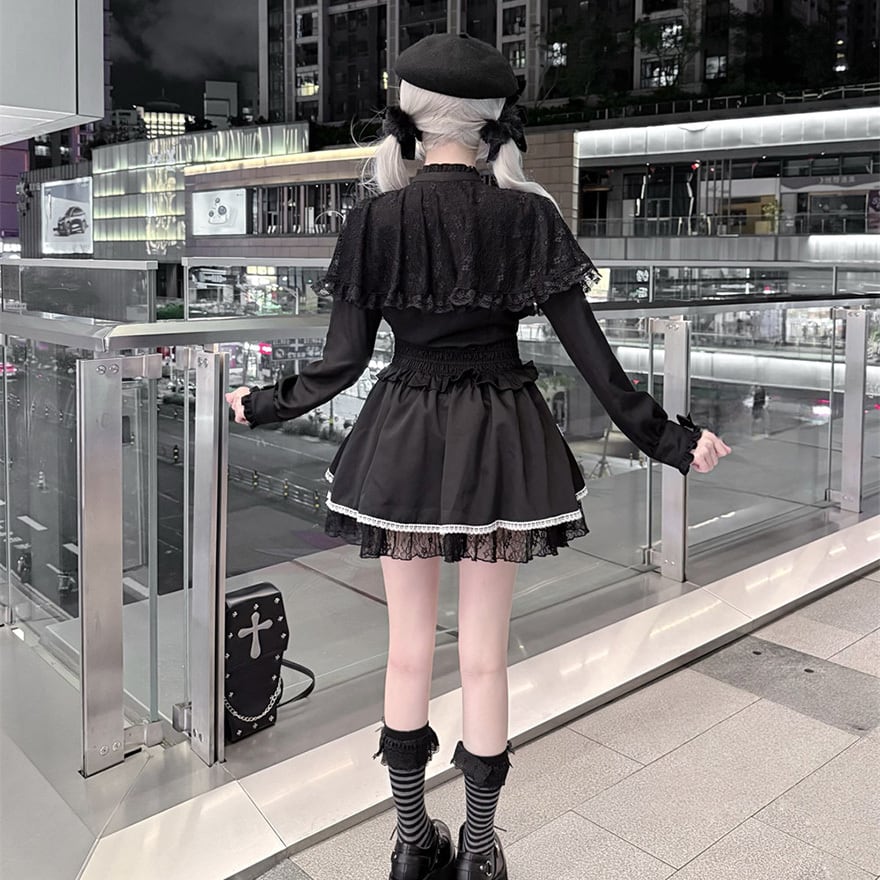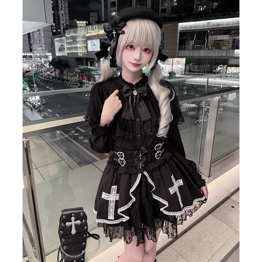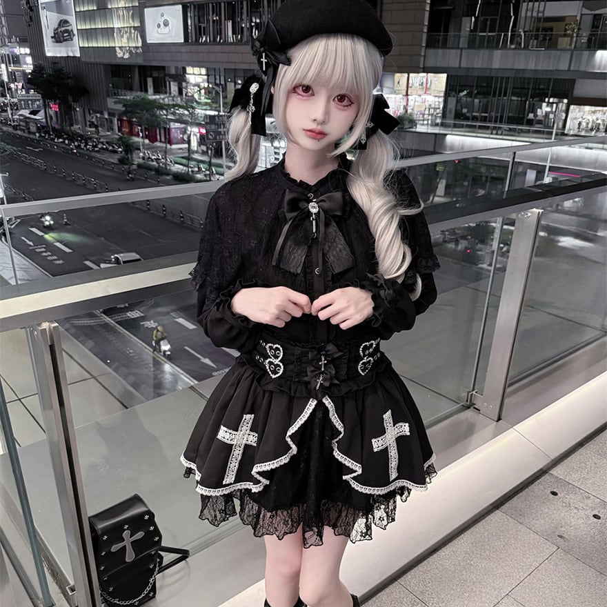 スカート前面には白いレースで縁取られた十字架の意匠が縫い付けられています。裾には透け感のある黒色レースが重なっています。