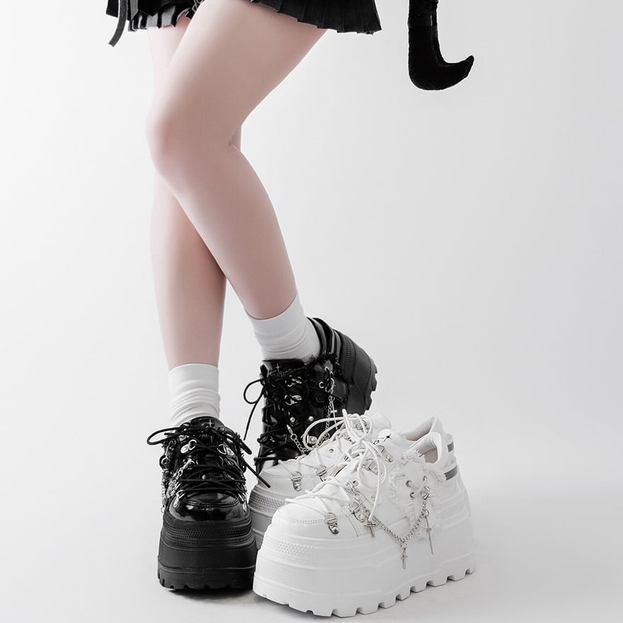 地雷系 シューズ 厚底スニーカー×スタッズ・ダブルリボン | 黒・白 推し活|SEASONZ