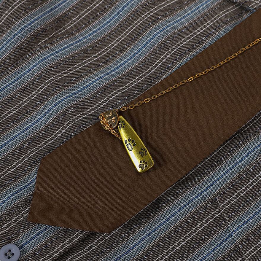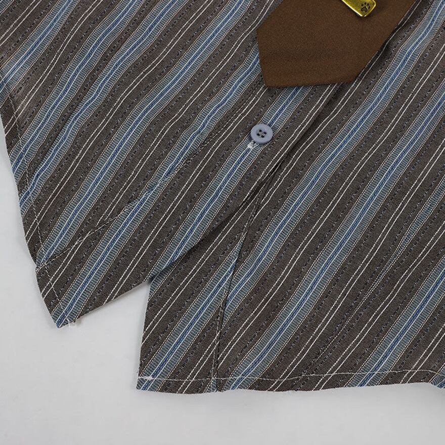 左胸にポケットが一つ配置され、袖口はボタン付きのカフス仕様です。付属の茶色のネクタイには、金色のボタン、安全ピン、細いチェーンの装飾が備わっています。