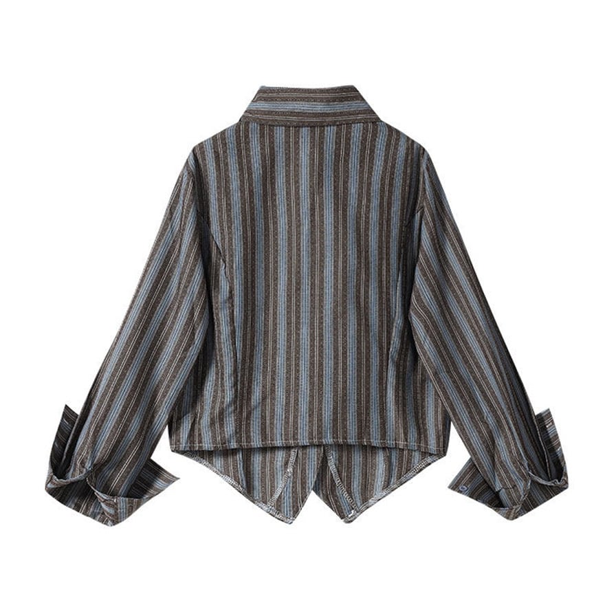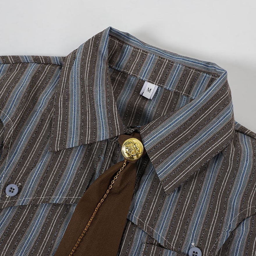 王子系・皇子系ロリータ(少年装)のストライプ柄シャツとネクタイの2点セットです。落ち着いたブラウンのストライプ地と、アシンメトリーな裾のデザインがマニッシュで洗練された印象を与えます。付属のネクタイにはアンティーク調の装飾が施され、クラシカルな世界観を演出。コンカフェのキャスト衣装やイベント、撮影会での男装風コーデに最適で、一味違うロリータスタイルを楽しみたい方におすすめです。