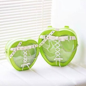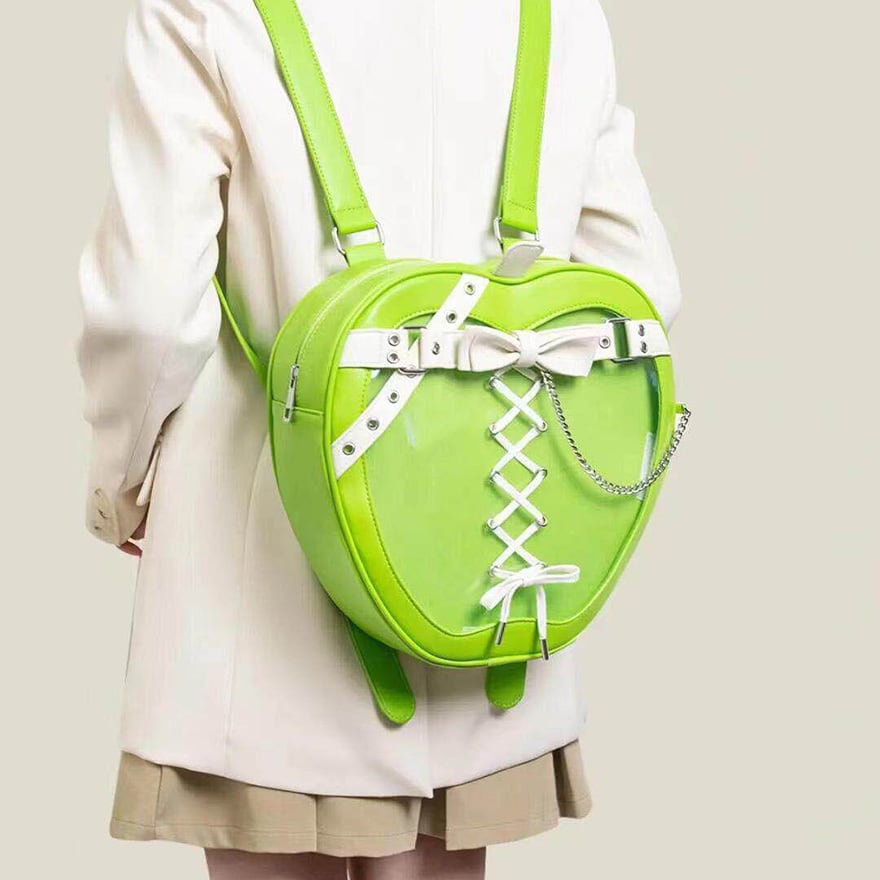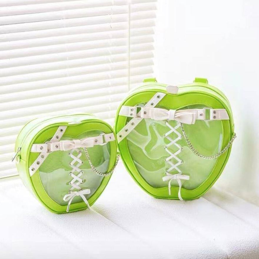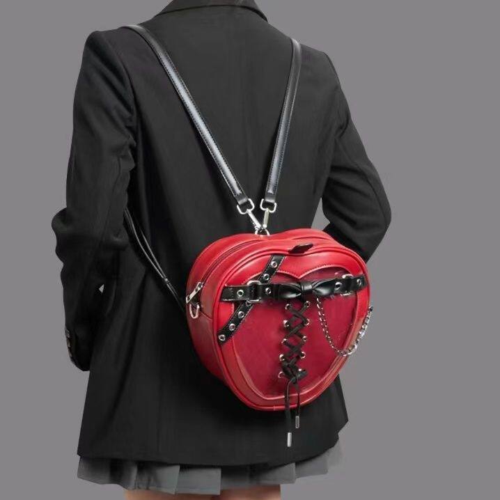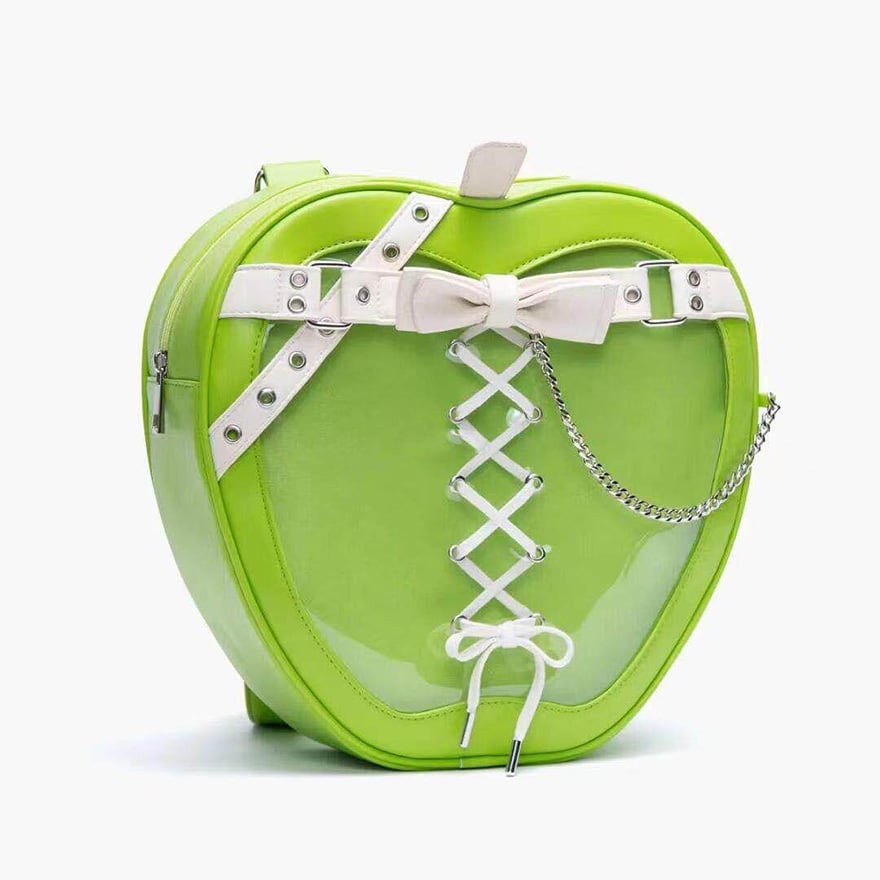地雷系やゴスロリファッションに映える、リンゴの形をした愛らしい2wayリュックです。フロントの透明窓にはレースアップとリボン、チェーンがあしらわれ、お気に入りのグッズを飾る痛バッグとしても楽しめます。深みのある赤色がコーディネートのアクセントに最適です。ライブやイベントでの推し活を華やかに彩ります。