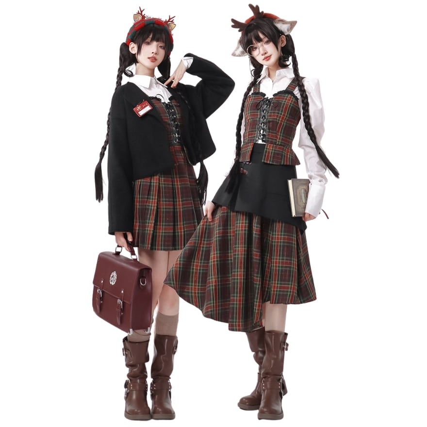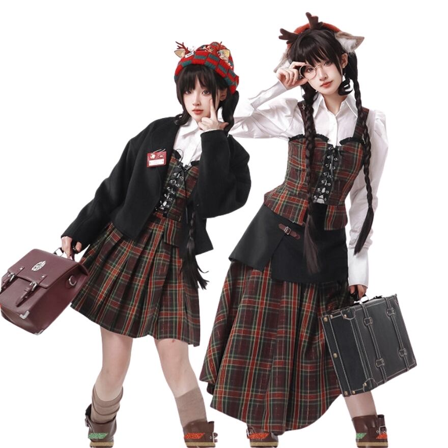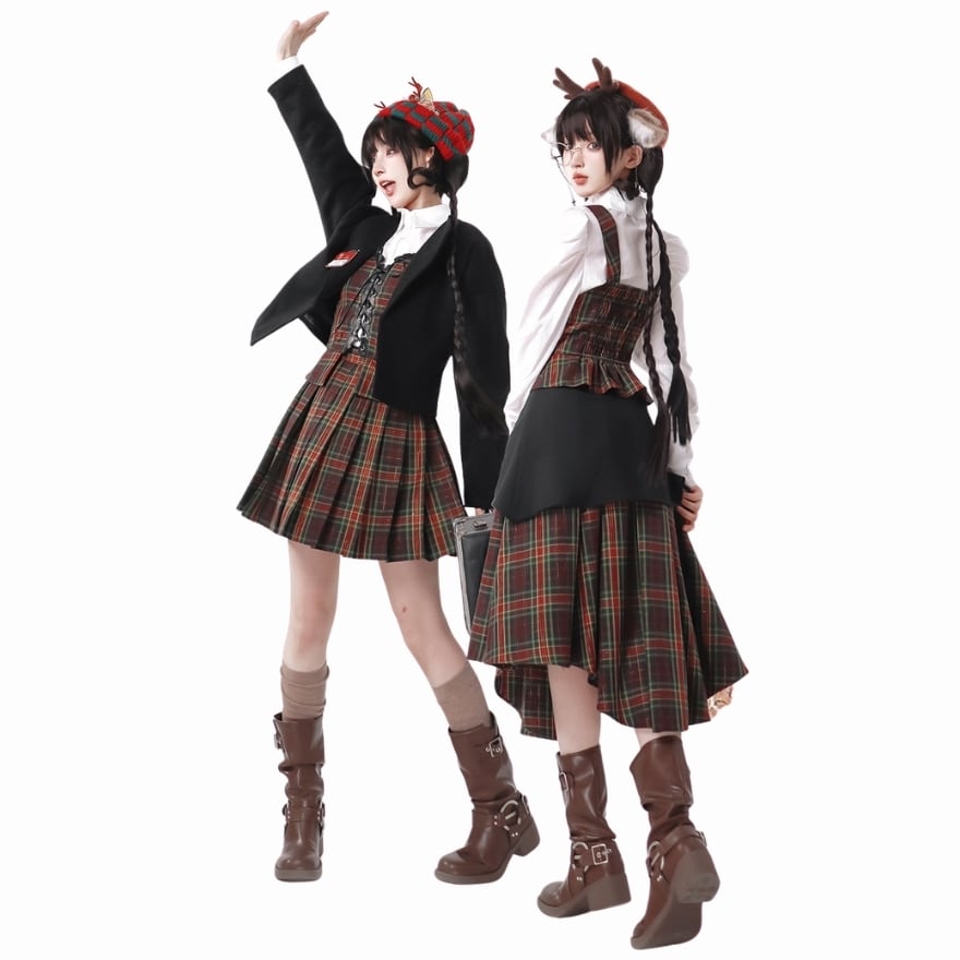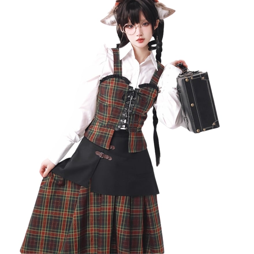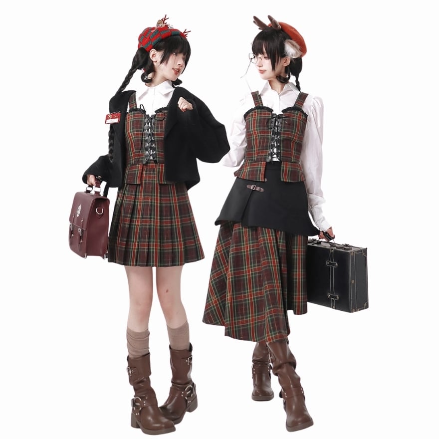クラロリ セットアップ3点 タータンチェック・編み上げ|赤×緑 学院風 お茶会|SEASONZ