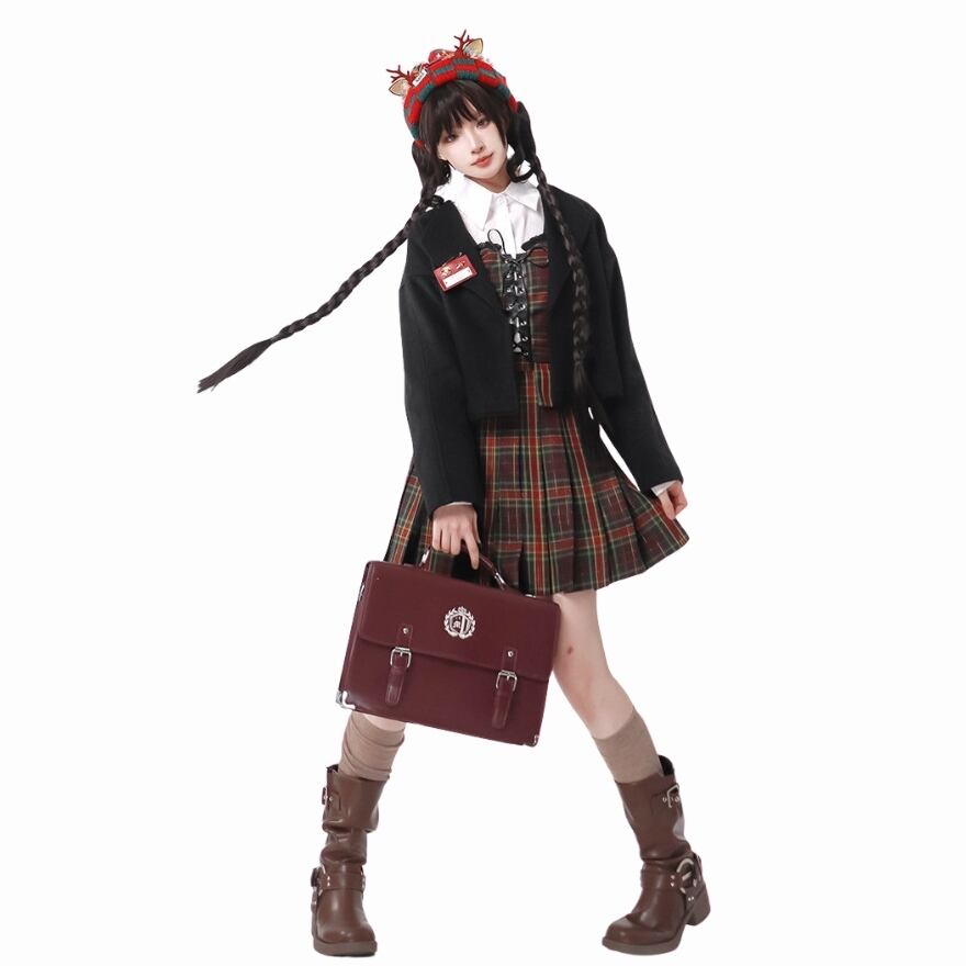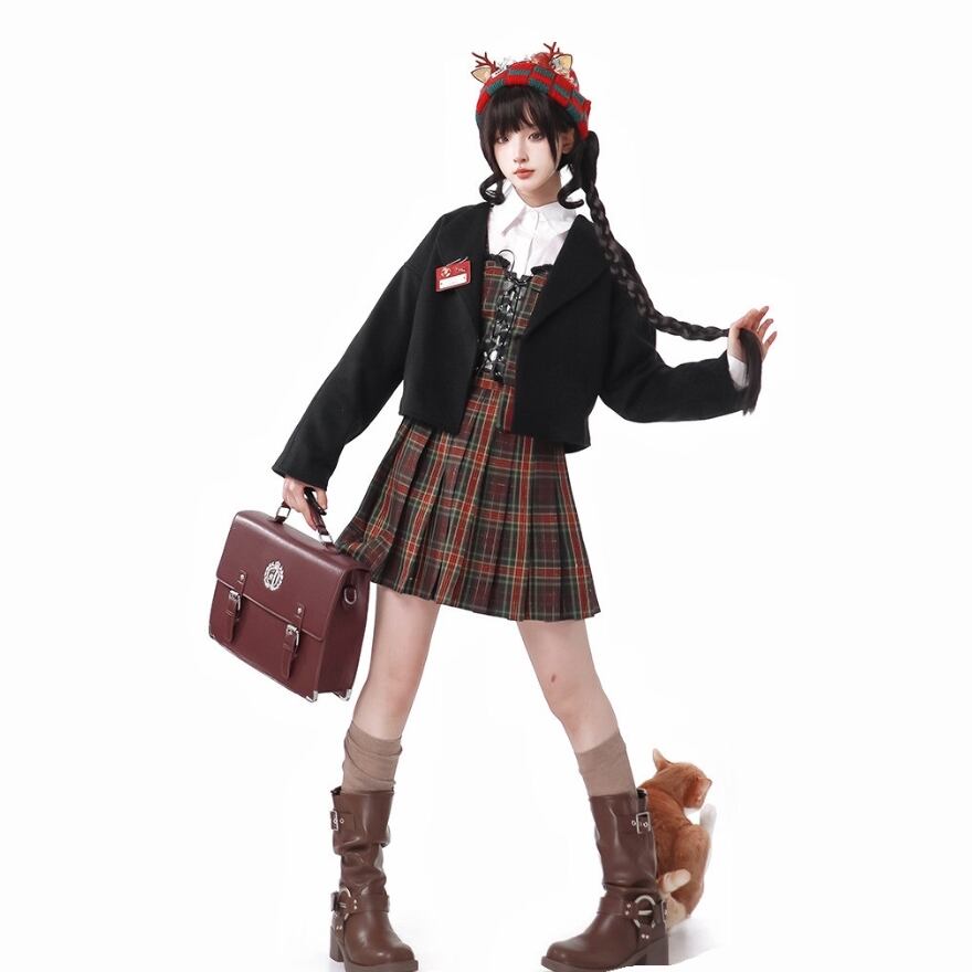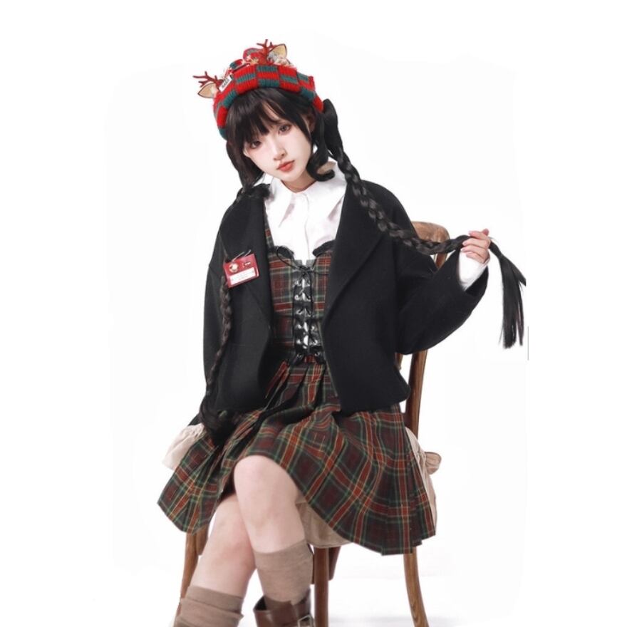 クラシカルロリィタの装いに最適な、英国風タータンチェックの3点セットです。編み上げ仕様のコルセットベストと、広がりすぎない上品なミドル丈スカートが知的な印象を与えます。ショート丈のジャケットを羽織ることで、統一感のある学院風スタイルが完成。お茶会やイベント、日常のお出かけを華やかに演出します。
