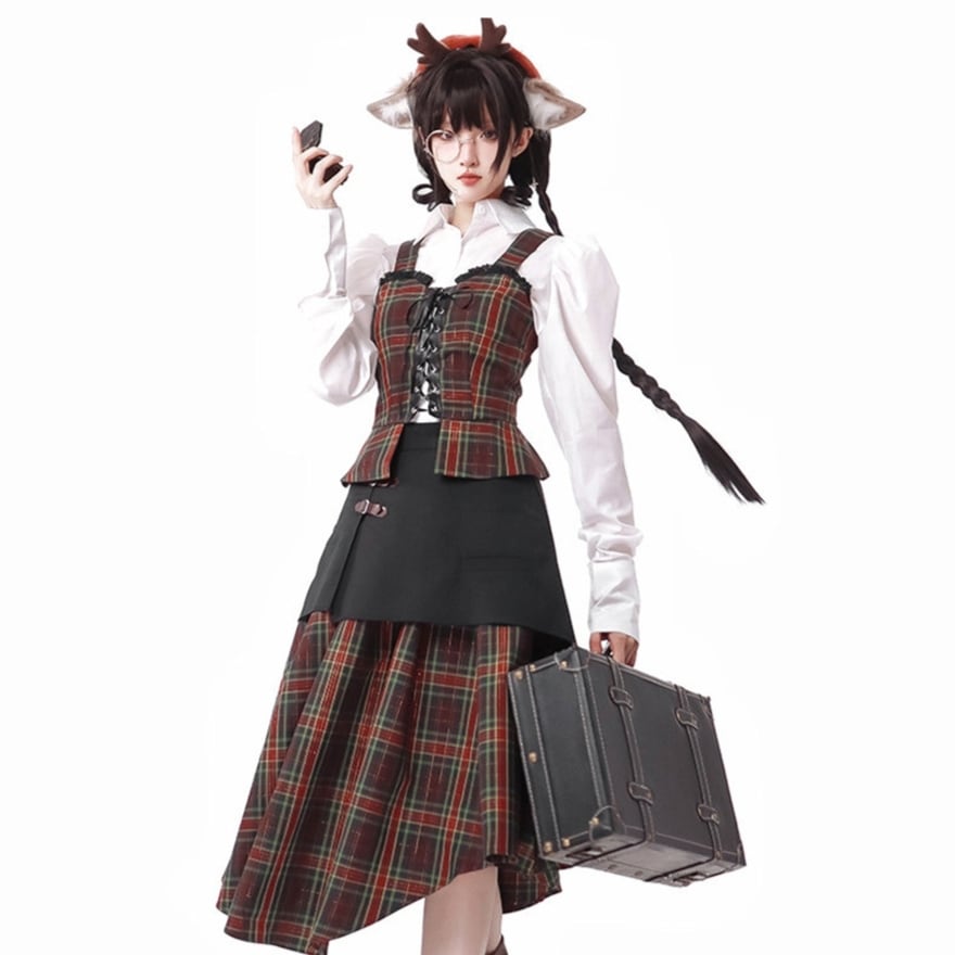 ベストはタータンチェック柄の生地を使用し、前面に黒い紐の編み上げと金属製のハトメ、肩には同柄のストラップがあります。