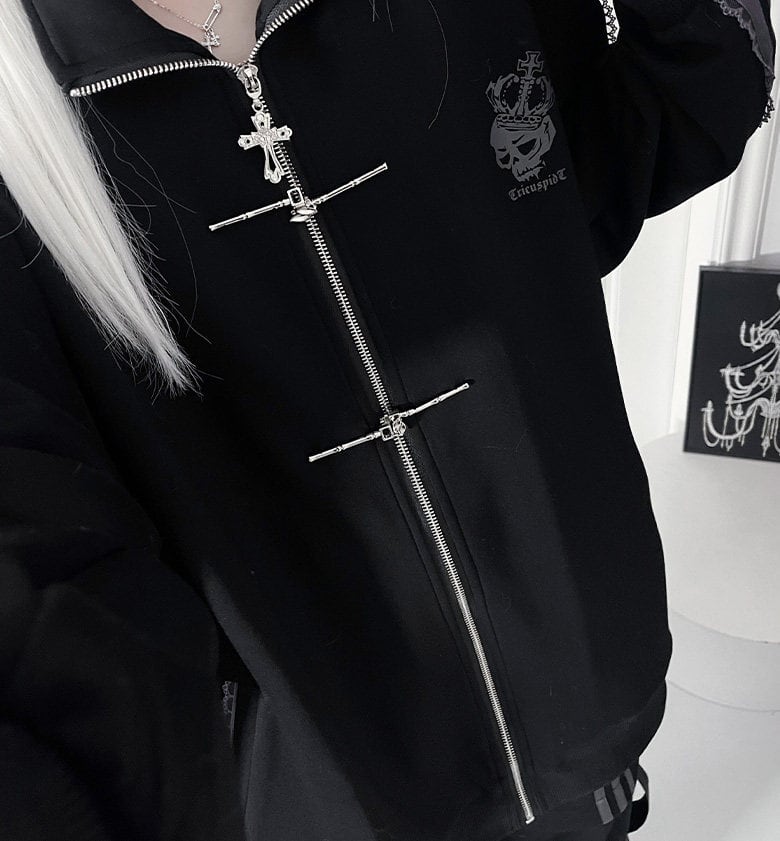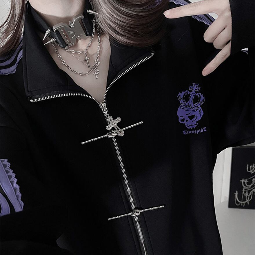 色は黒を基調とし、刺繍と袖ラインの色がグレーまたは紫の二種類あります。前面ジッパーには十字架の引手と、横方向に三箇所の金属製装飾が配置されています。
