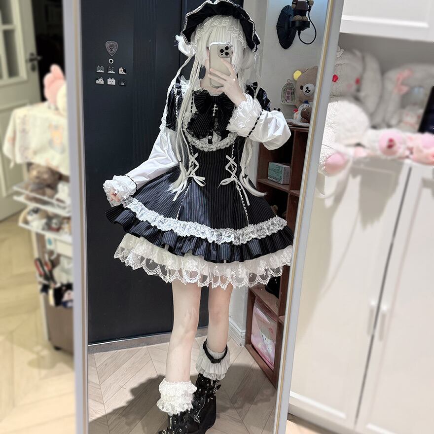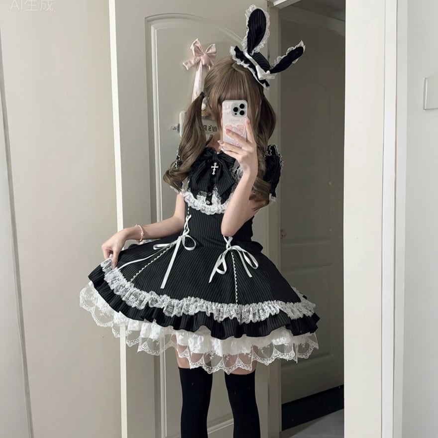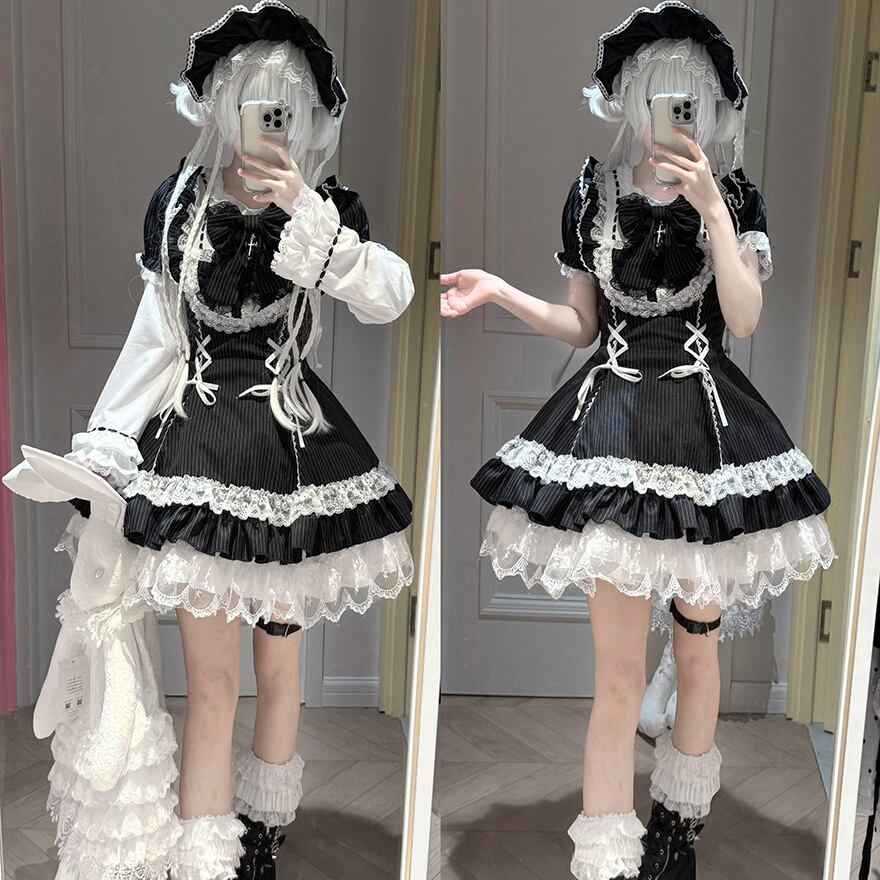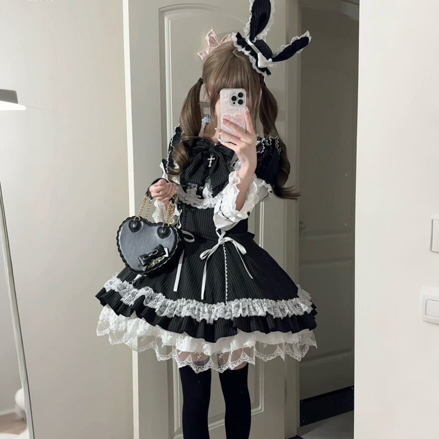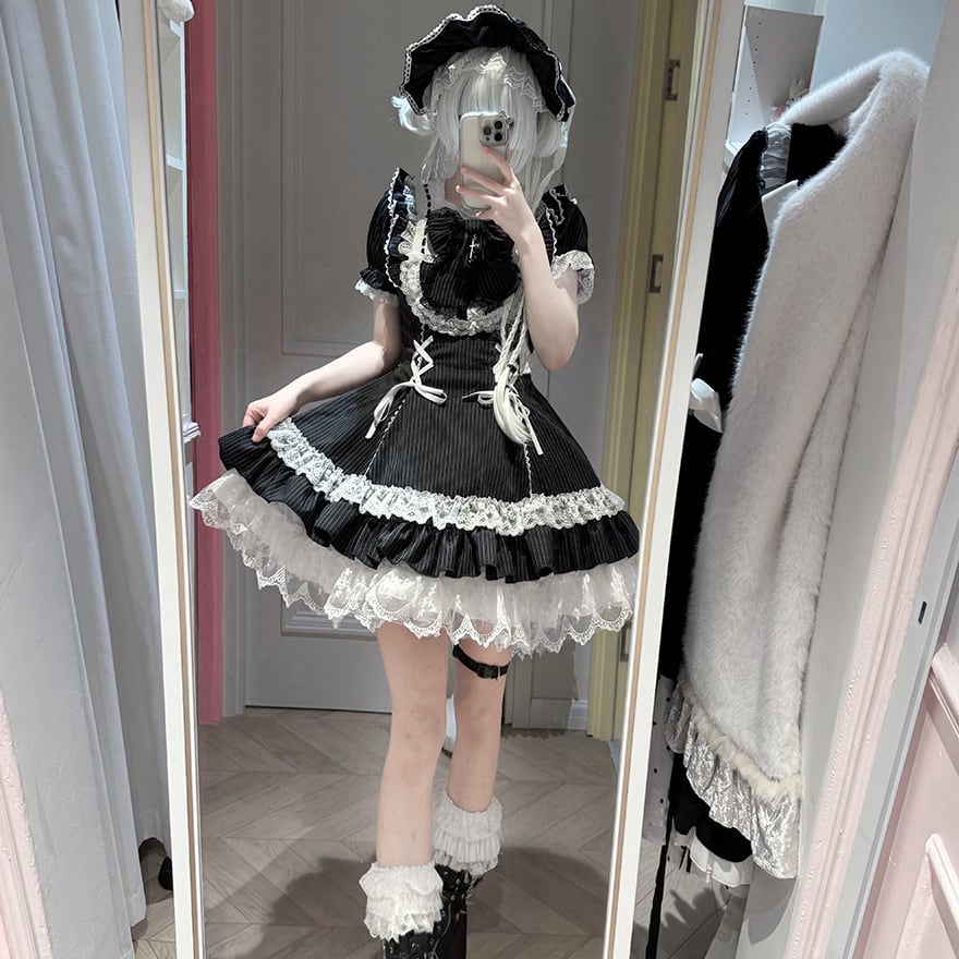 ゴシックロリィタや地雷系に最適な、黒白ストライプ柄の半袖ワンピースです。取り外し可能な付け袖が付属し、ロングスリーブとしても着用できる2way仕様が魅力。胸元の大きなリボンと十字架チャーム、幾重にも重なったフリルがダークで可愛い世界観を演出します。コンカフェ衣装やイベント、撮影会で個性を放つ一着です。